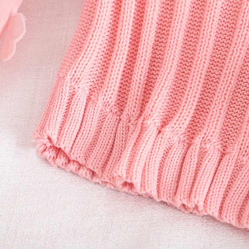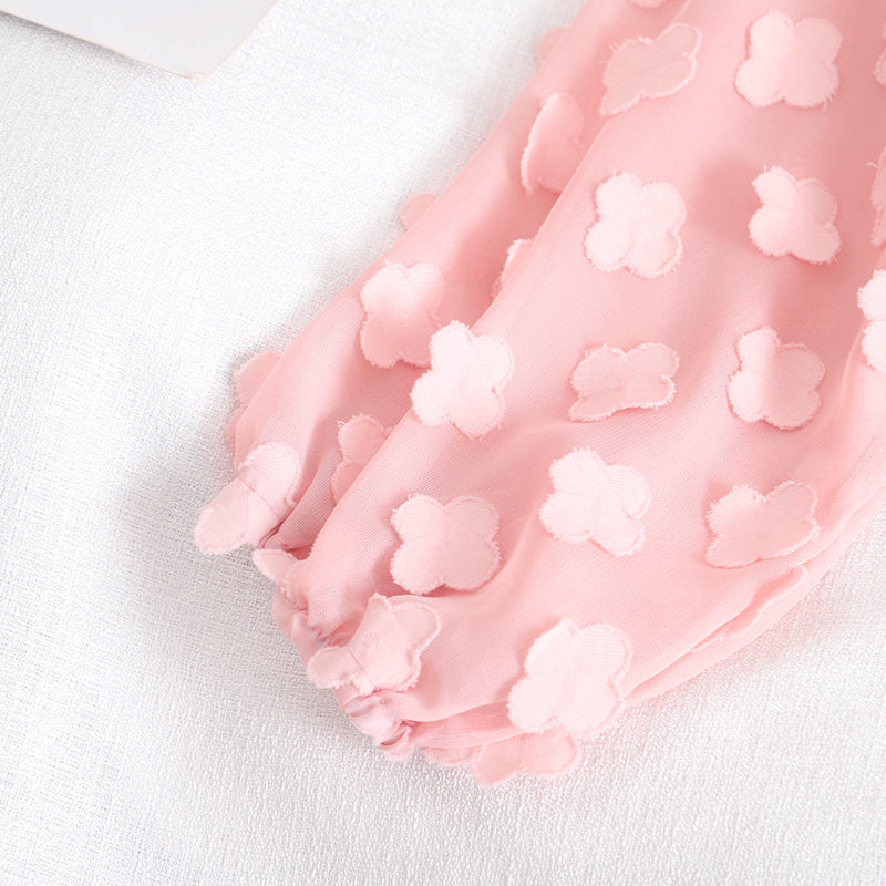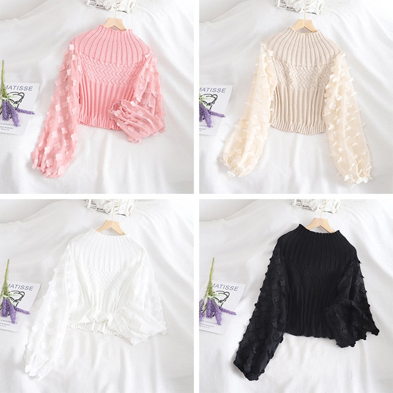 Computer Knitted Acrylic Cotton Polyester Blouse with Lantern See-Through Sleeve and Floral Appliques Decoration