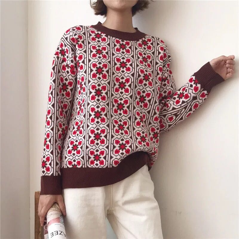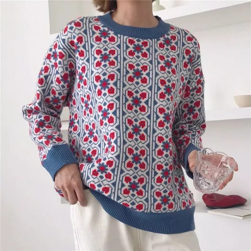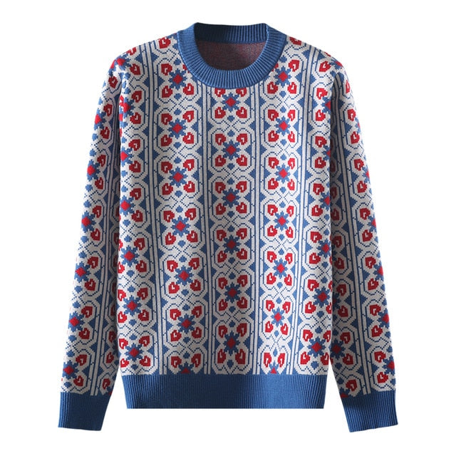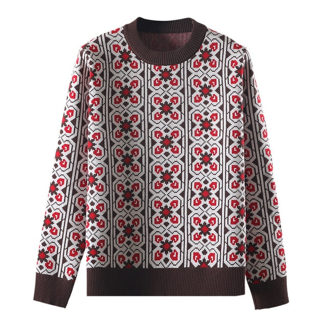 O-Neck Collared Sweater with Geometric Pattern, Viscose Material, and Knitted Fabric Type