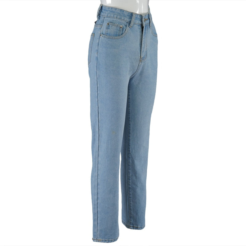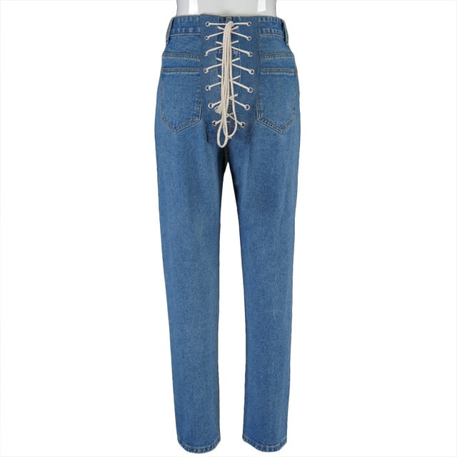 Bleached Washed High Waist Cotton Jeans with Lace-Up Decoration