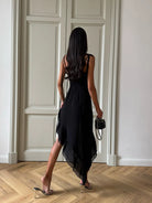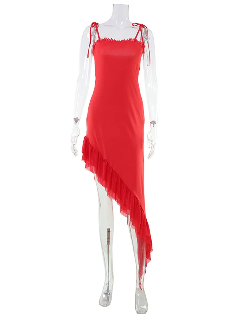 Dare to turn heads in this audacious mini dress that defies convention. The diagonal asymmetrical cut creates an unexpected silhouette that moves with confidence, while delicate ruffles add a playful edge. Perfect for those who refuse to blend in—this piece demands attention and rewards the bold. Slip into something that challenges the ordinary and celebrates your fearless style.
