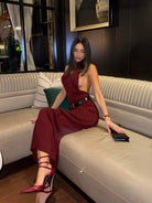 Dare to turn heads in this sultry Temptation Tease Maxi Dress. Crafted from a breathable polyester and spandex blend, this figure-hugging gown features a bold halter neckline that commands attention. The stretchy fabric moves with you, offering comfort without compromise. Perfect for nights when you want to make an unforgettable impression and embrace your most confident self.