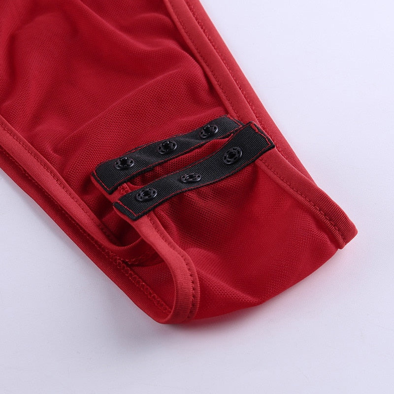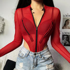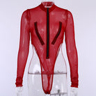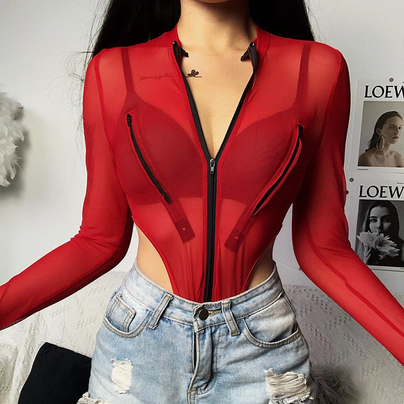 Full Sleeve See Through Bodysuit with Zipper Closure and Mesh Polyester Material