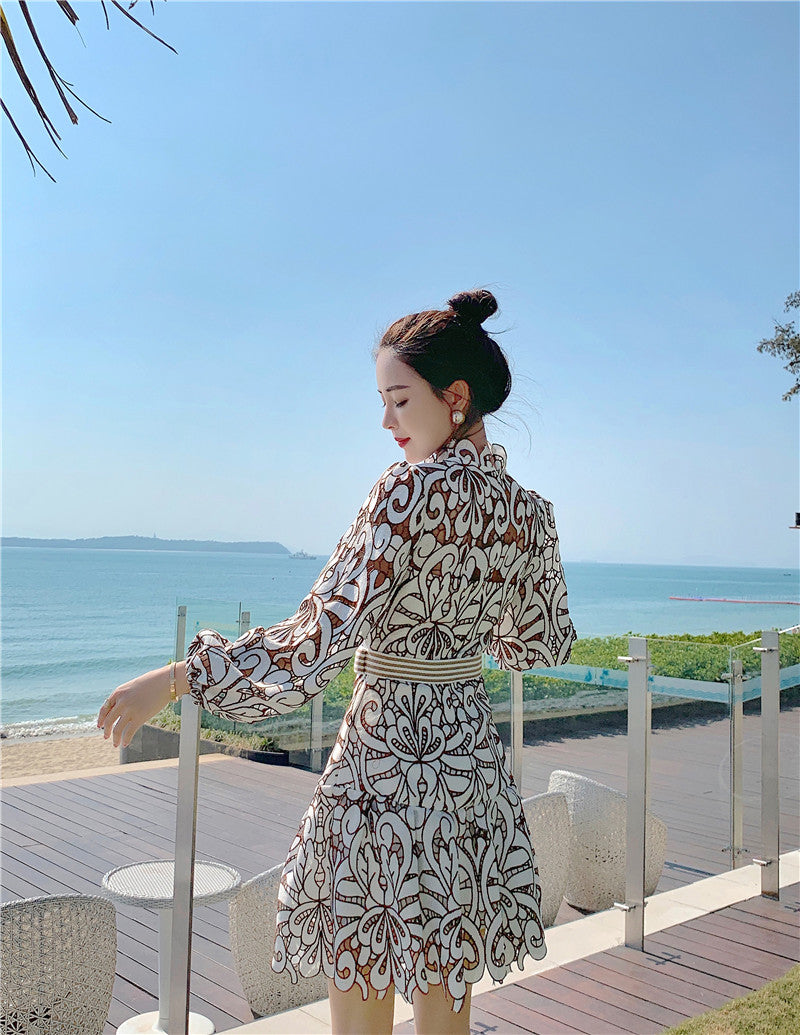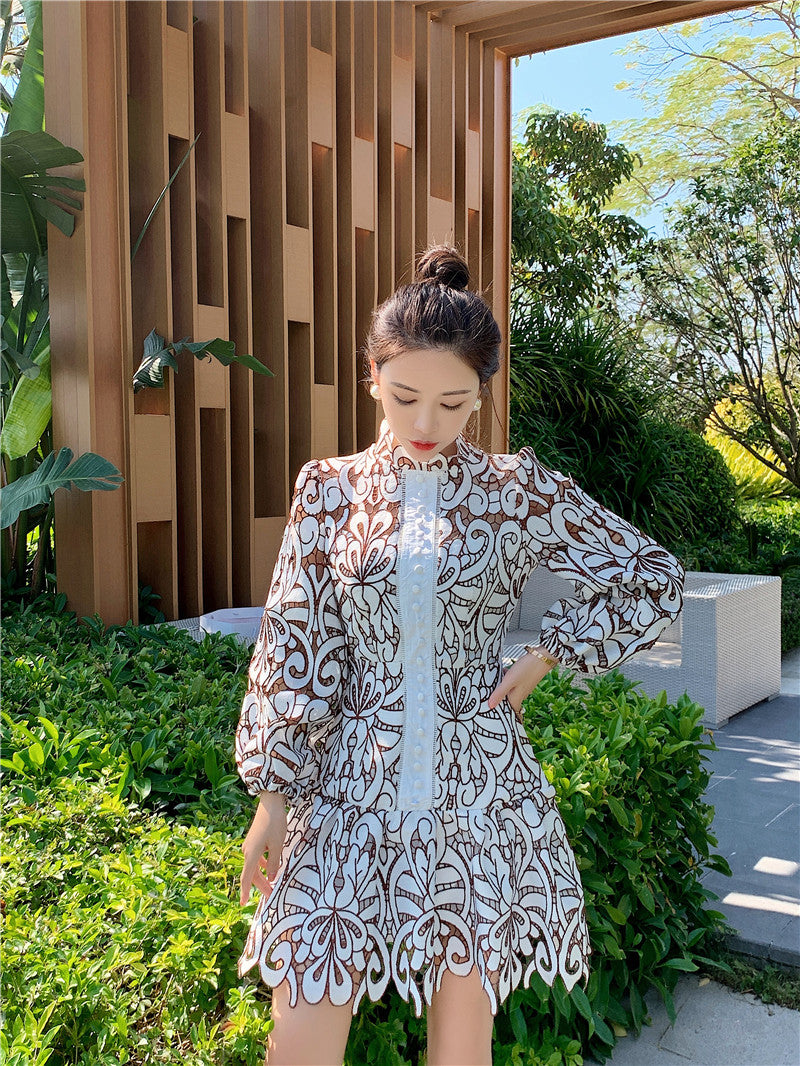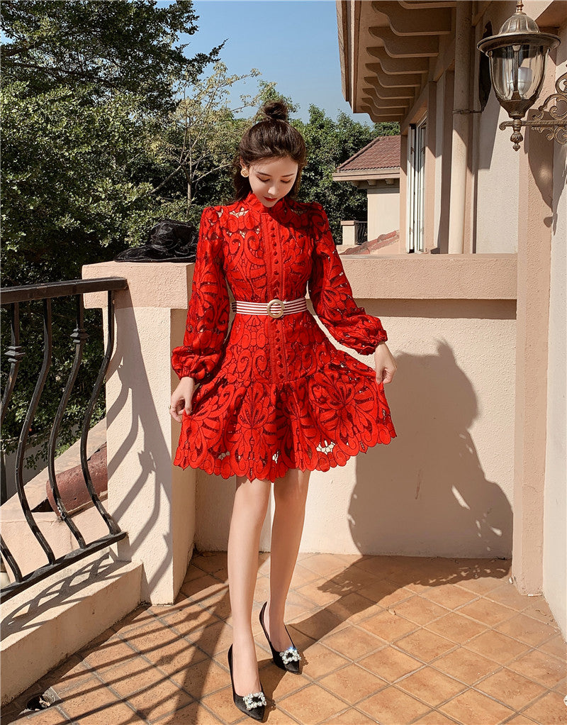 This dress is the perfect outfit to enjoy a sunny day out with your loved ones. The hollow-out lace flower is beautifully designed with long lantern sleeves. The empire waist will accentuate your figure. Available in solid and pattern variants, get the best fit for your style!