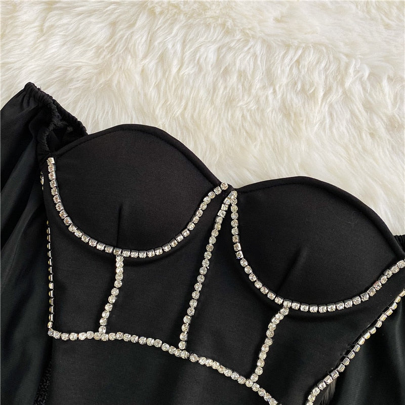 Strapless Crop Top with Long Lantern Sleeve and Beads Decoration