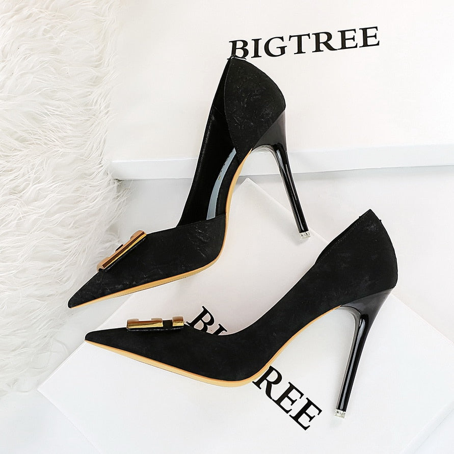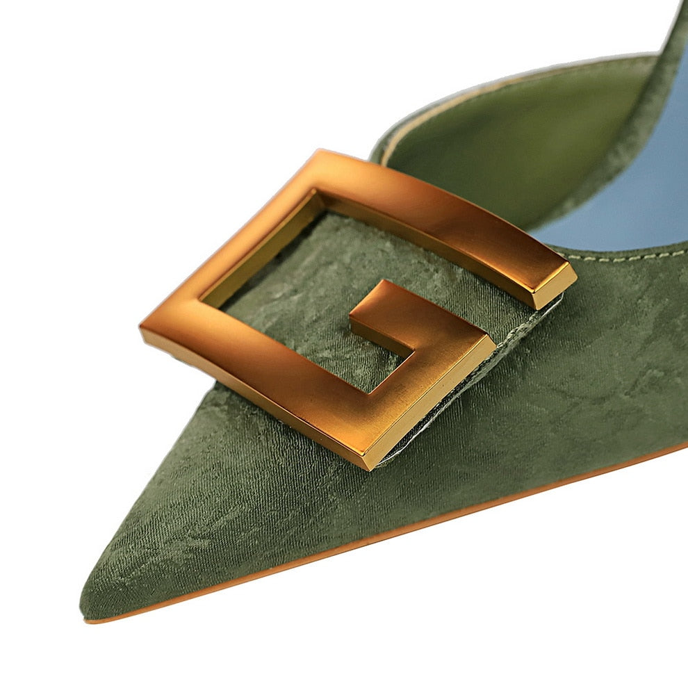 Pointed Toe Stiletto with G Buckle Decoration made from Cotton Fabric and Soft Leather Material