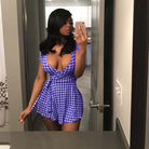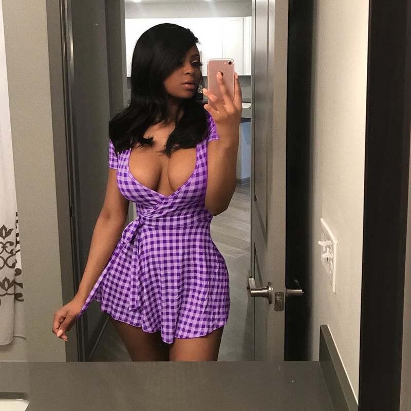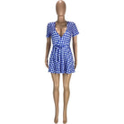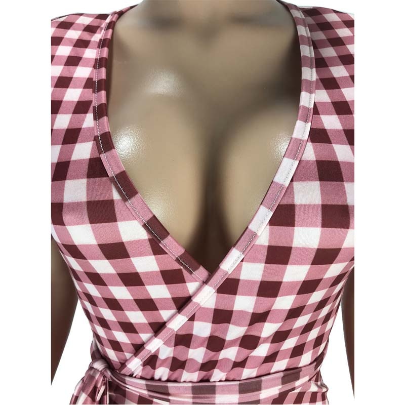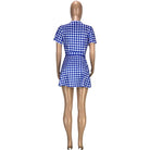 Short-Sleeved Mini Dress with Plaid Pattern, V-Neck Collar, and Sashes Decoration