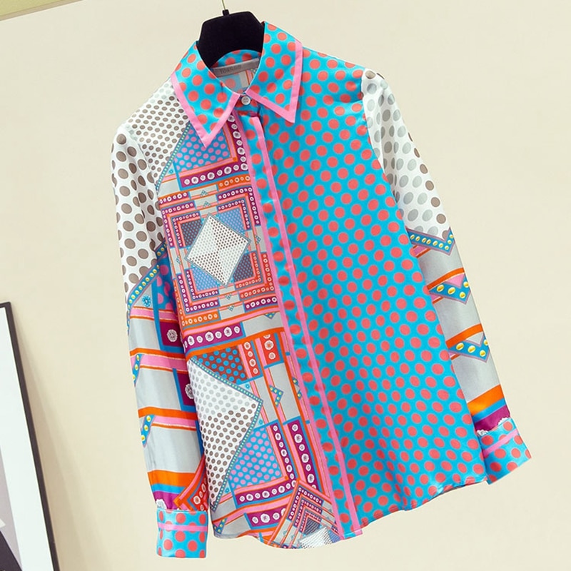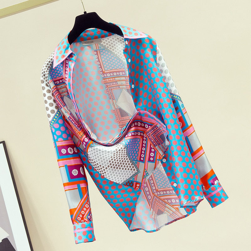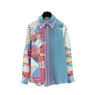 Long-Sleeved Polyester Silk Shirt with Colorful Geometric Patchwork Style