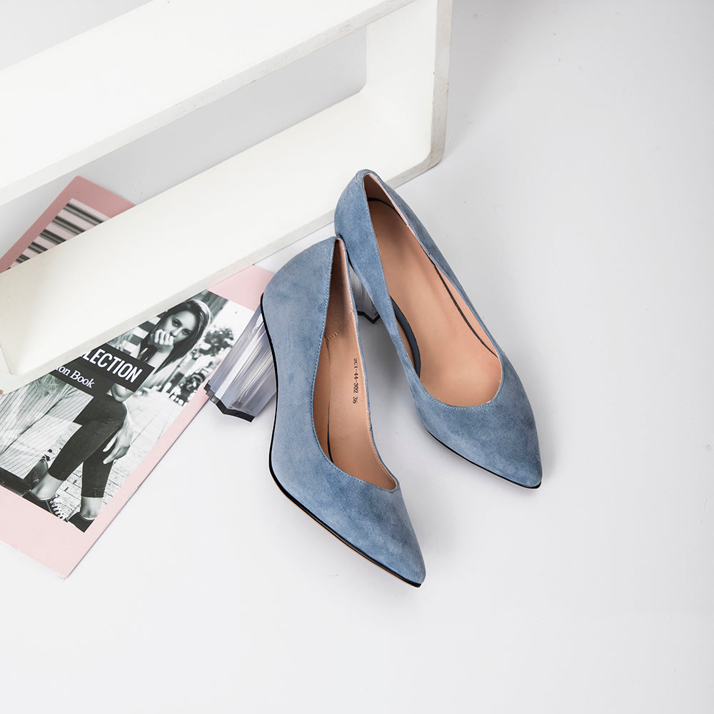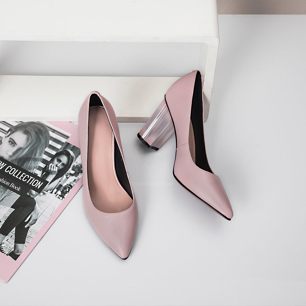 Solid Genuine Sheepskin Leather Slip-On Pump Shoes with Unique Chunky Heels