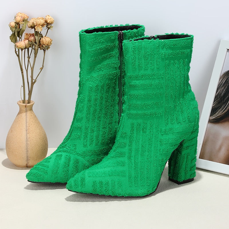 These women's boots are made of canvas and feature a zipper closure, which makes it easy to get in and out of the boots. They are a mid-calf height and has green color.