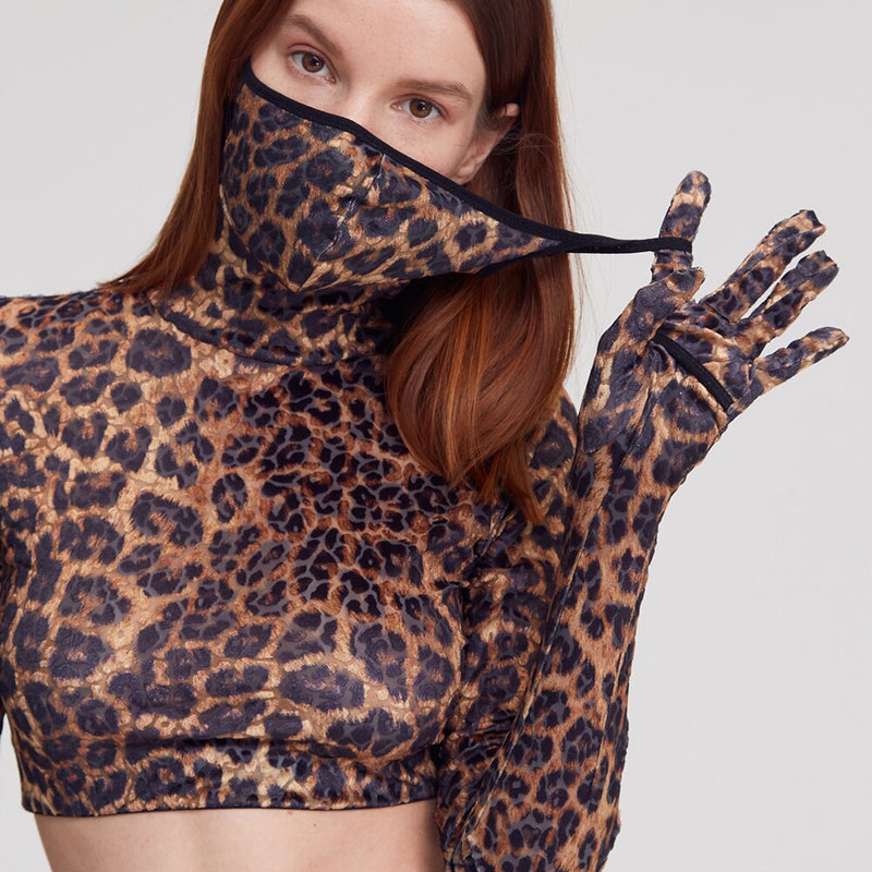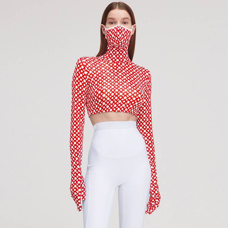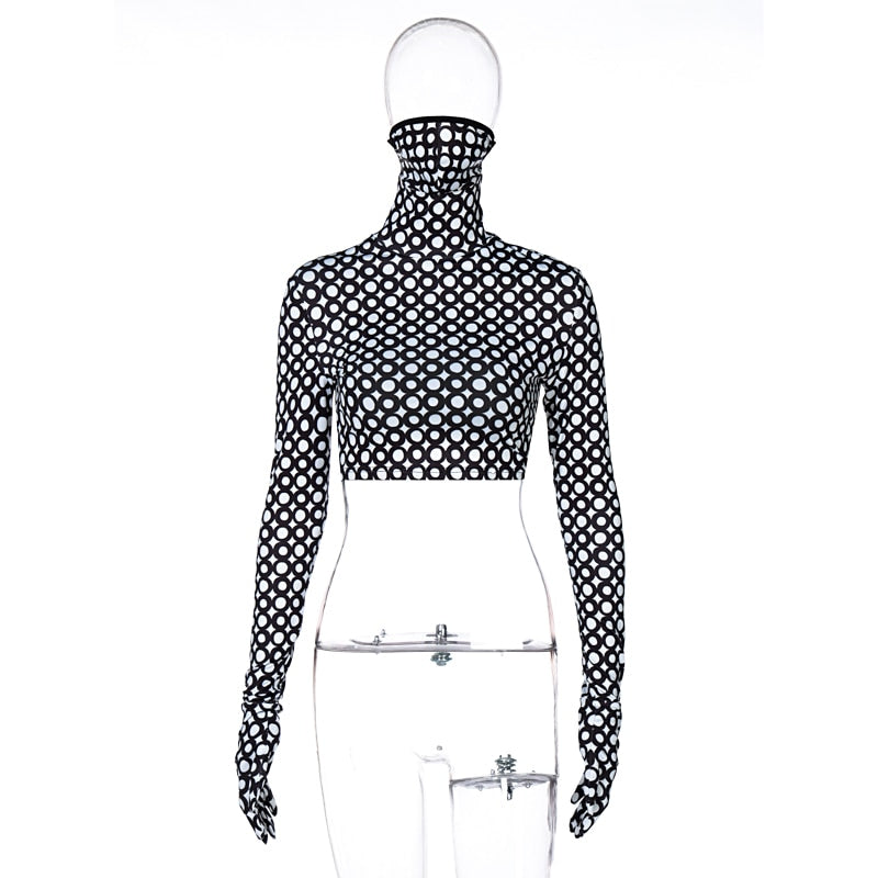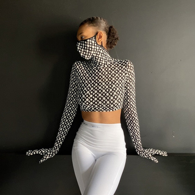 Long-Sleeved Polyester Spandex Crop Top with Face Mask Decoration