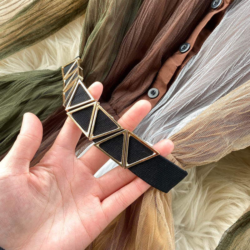 Multicolor Long Lantern Sleeved Maxi Dress with Turn Down Collar made from Acrylic Mesh Material