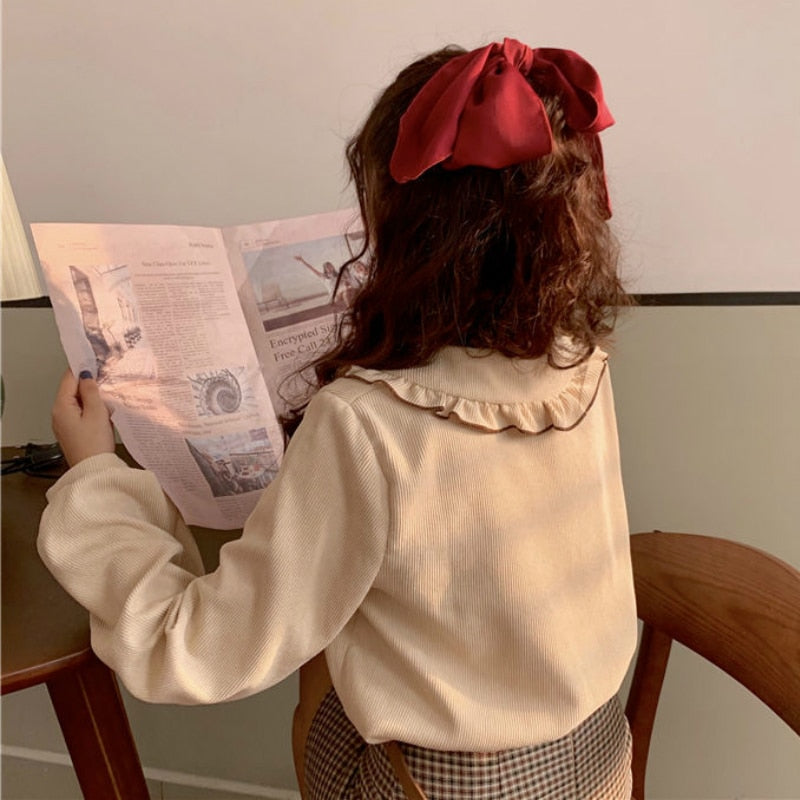 This blouse is made of polyester and has a bow decoration on the front. It has long sleeves and is solid in color.
