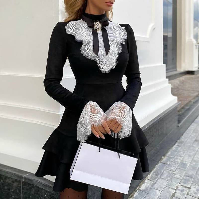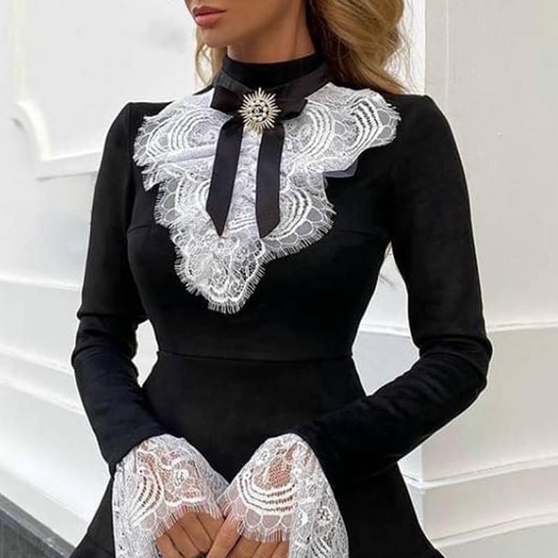 This is a sophisticated women classic cotton dress that is sure to become a staple in your wardrobe. The alluring black color looks great with the lace decoration. A simple yet elegant design with a classic O-collar neckline and bow ensures you are styling your look in style. The long, flowing petal sleeves are make you looks more beautiful.