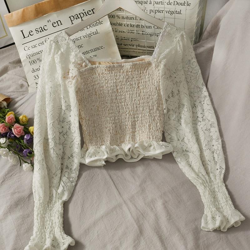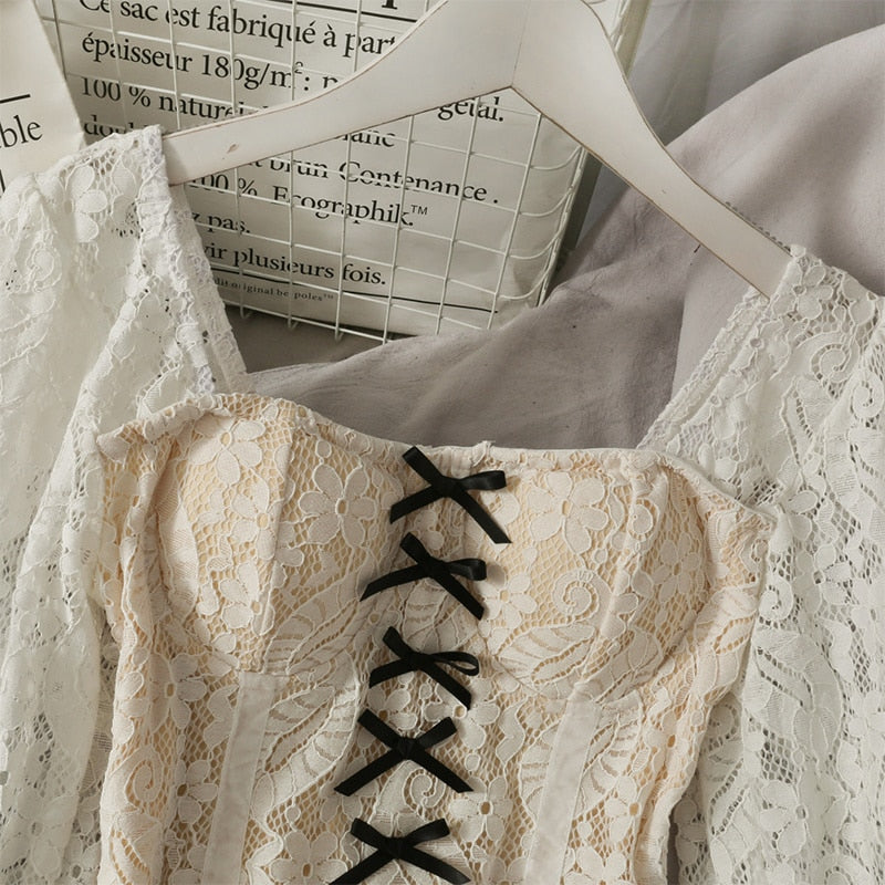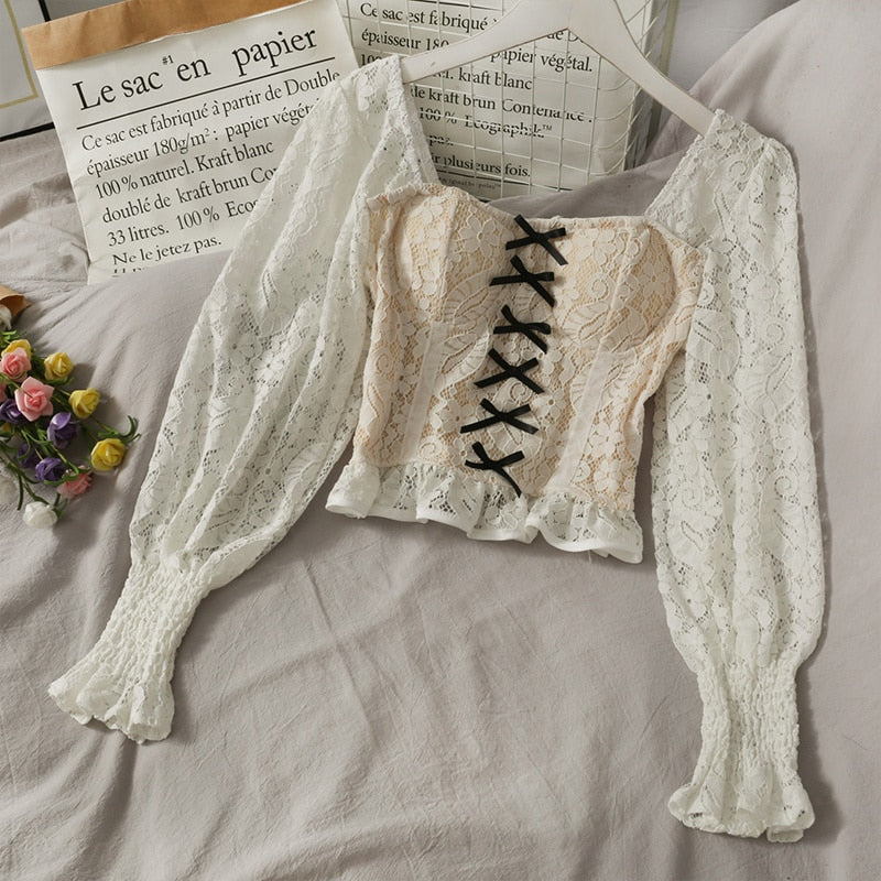 Long Lantern Sleeved Blouse with Square Collar and Front Lace-Up Decoration