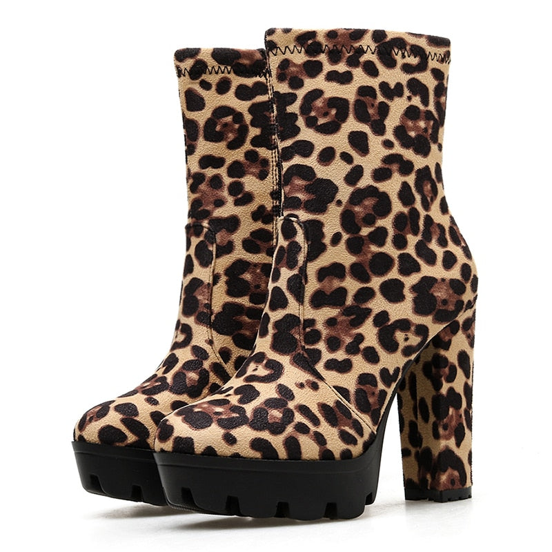 Sexy Leopard Printed Chunky Heels Round Toe Women Ankle Boots