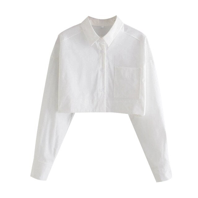Long-Sleeved Turn-Down Collar Cropped Shirt with Pocket and Button Closure