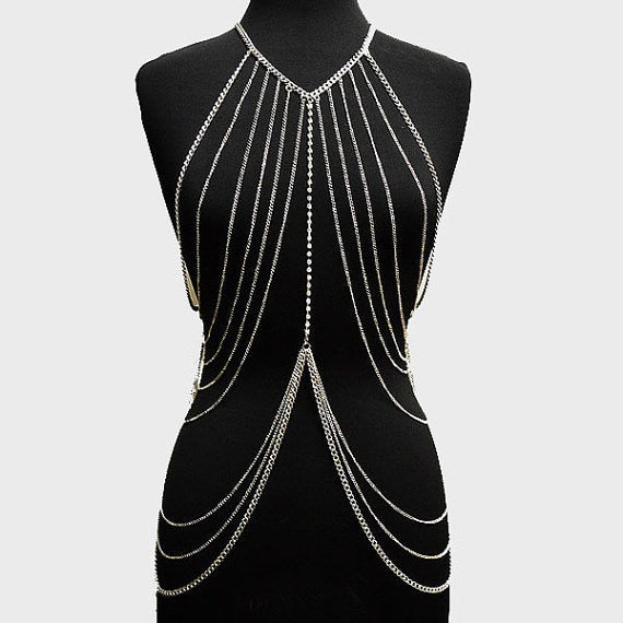 This body jewelry is made from high-quality zinc alloy metal. The halter chain features a long drape chain design. Wear this piece over a dress and be ready to grab people's attention. This piece is a simple way to add more luxury to your outfit.