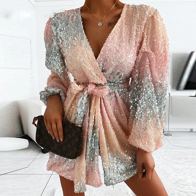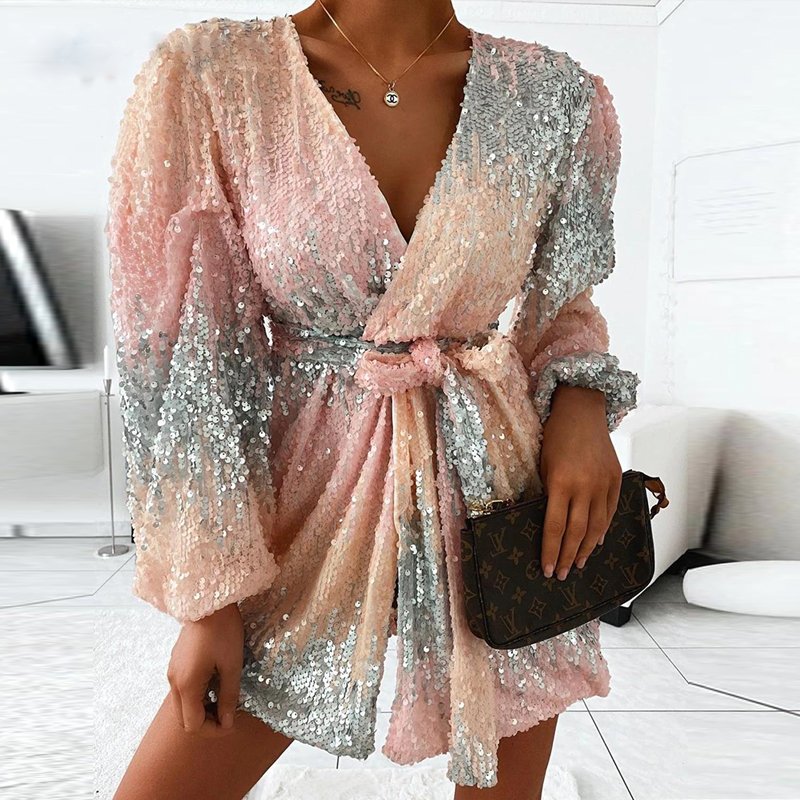A mini dress is a staple in every girl's wardrobe, and we've got a list of colorful styles to choose from. This sequin dress has a deep v-neck, long lantern sleeves, and a loose fit. The lightweight material and color block pattern make it perfect for the summer season. The sequin fabric adds a fun and glamorous look that is sure to turn heads.