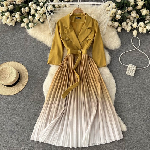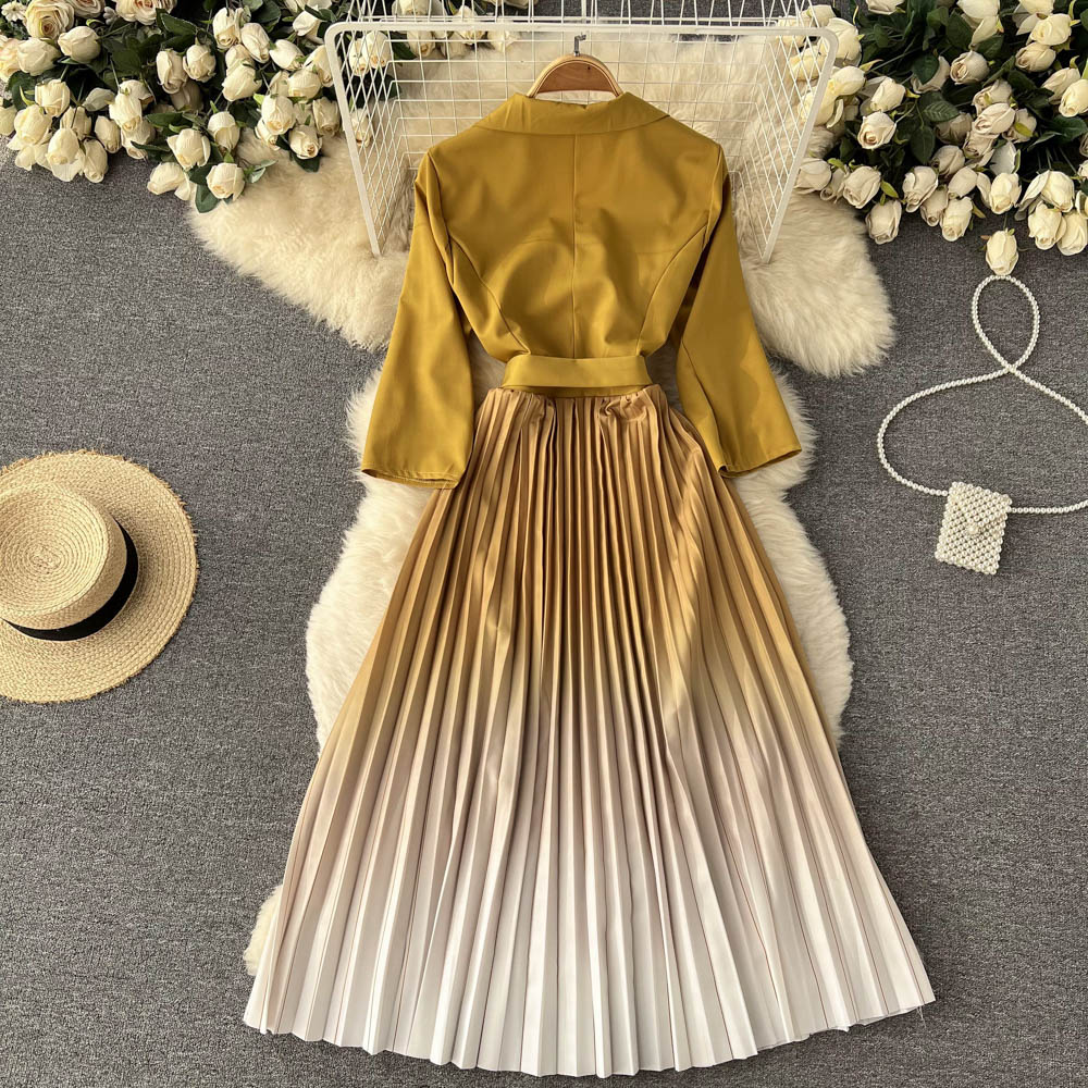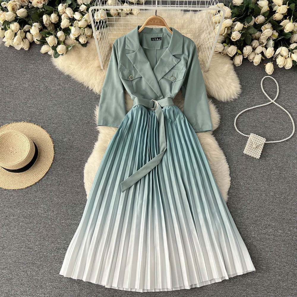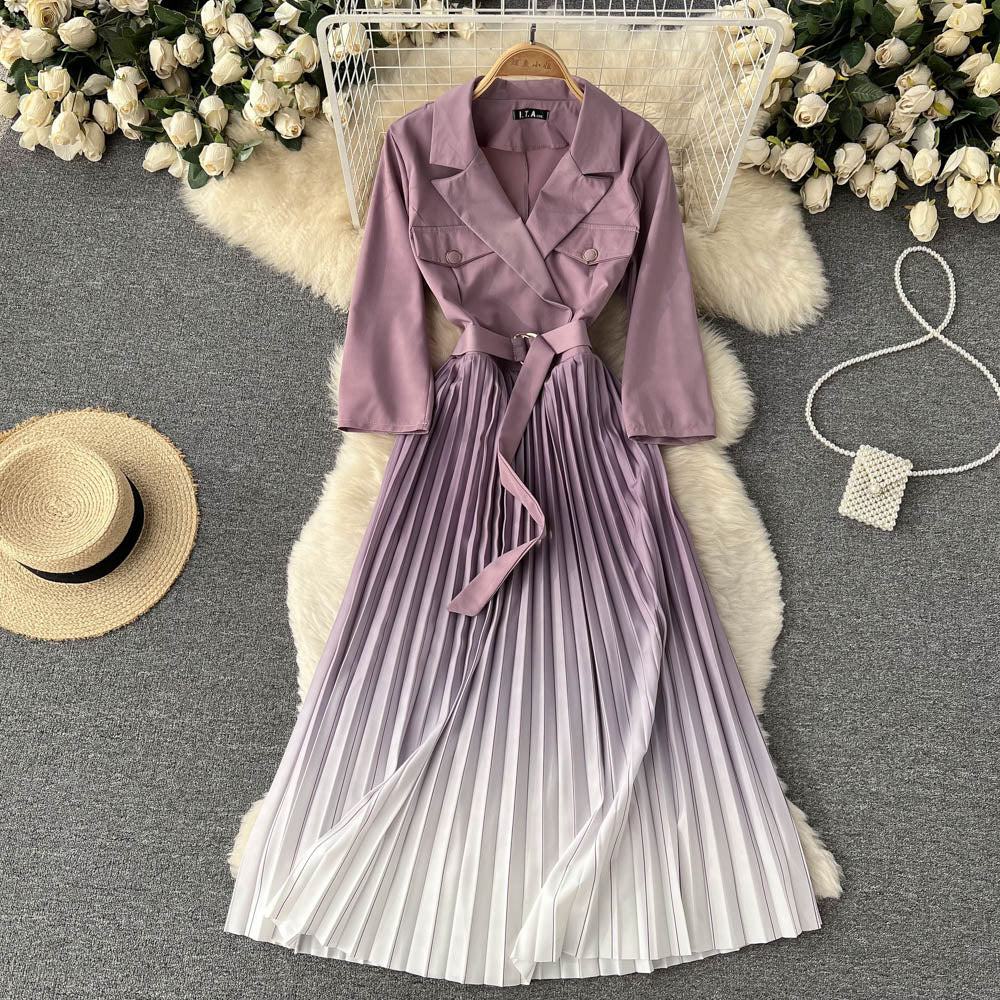 A classic and elegant long-sleeved dress always looks great. The flared silhouette makes it easy to move around while the wide lapel collar adds a beautiful finishing touch. A lovely gradation color adds a pop of color to any look. The lightweight fabric is soft and form-fitting for a flattering fit.