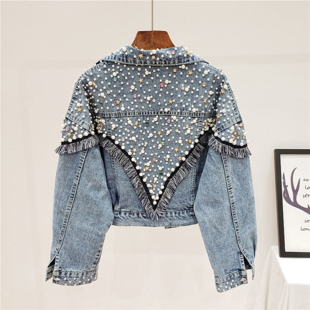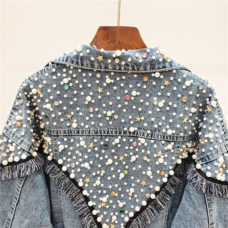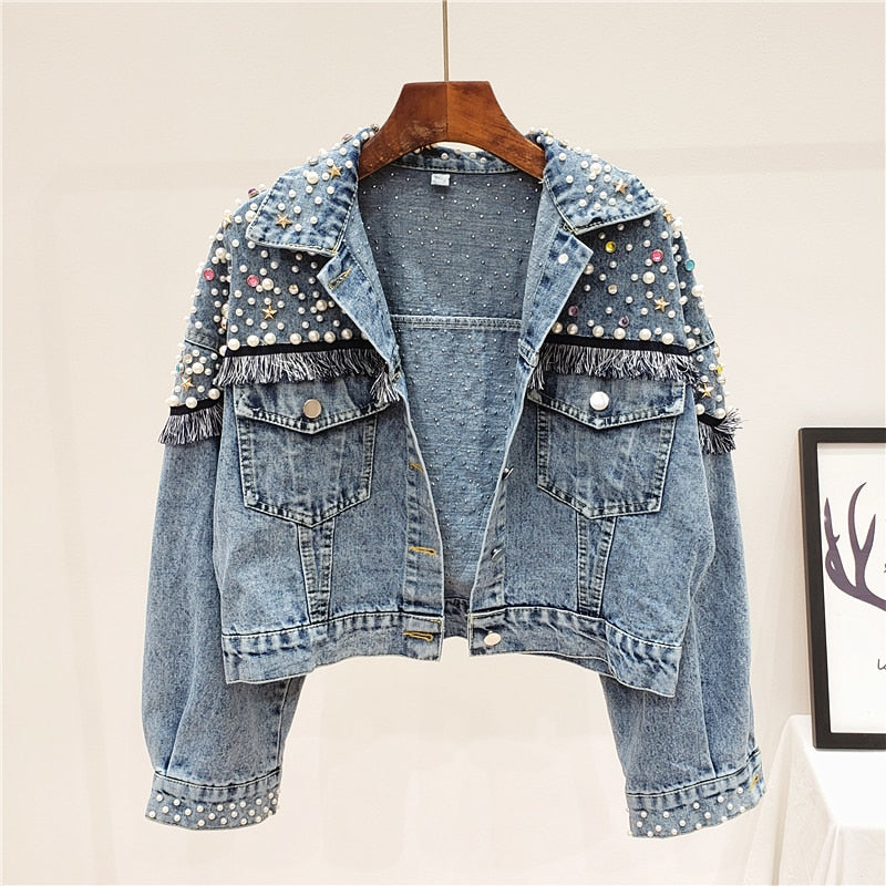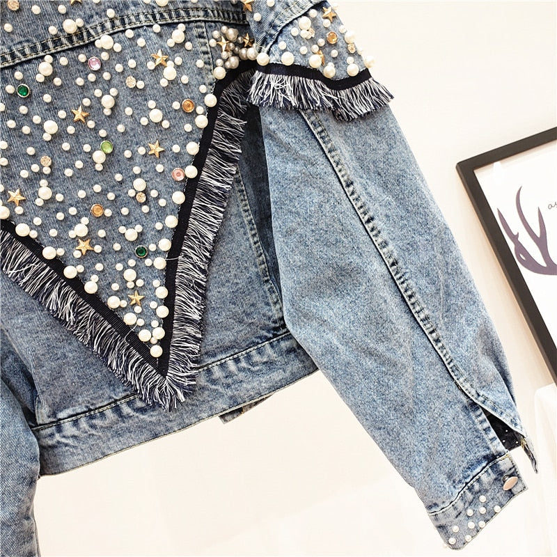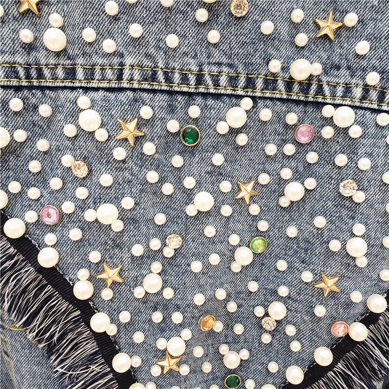 Turn-Down Collared Denim Jacket with Pocket, Beads, and Pearls Decoration