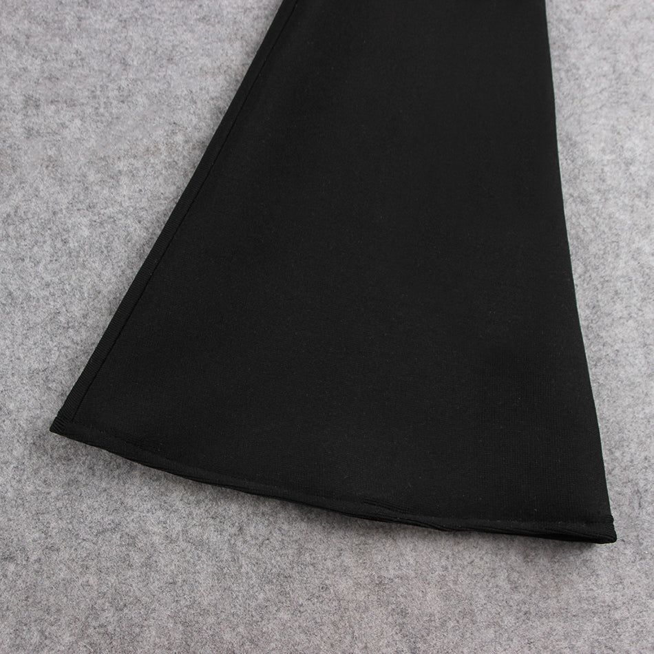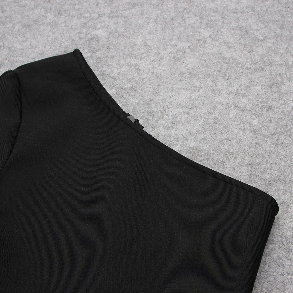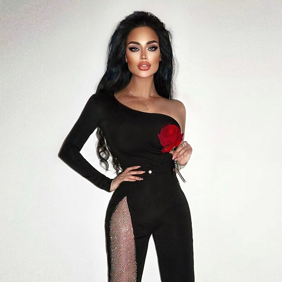 Solid One-Shoulder Long-Sleeved Nylon Rayon Spandex Jumpsuit with Wide Legs and Rhinestone Decorated Fish Net Patchwork Style