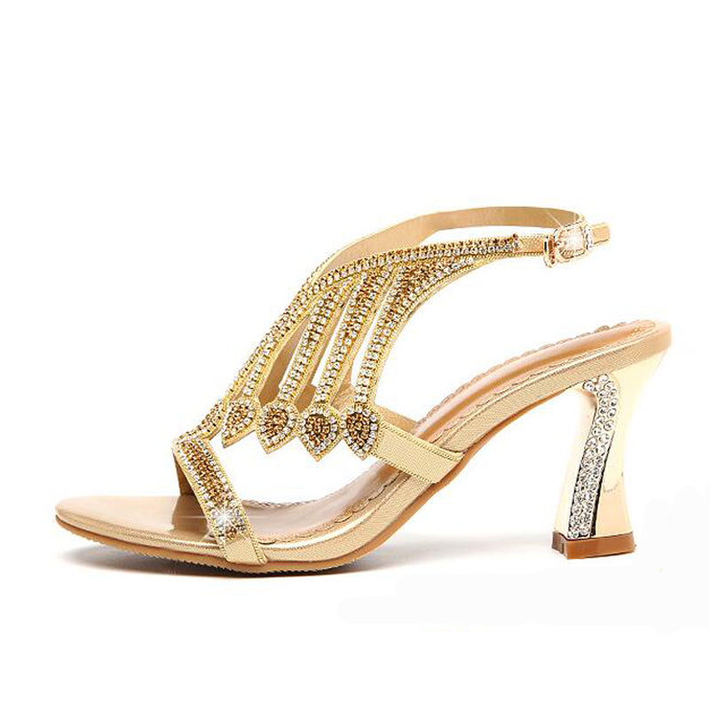 Genuine Leather Crystal Decorations Heeled Sandal Square Heels