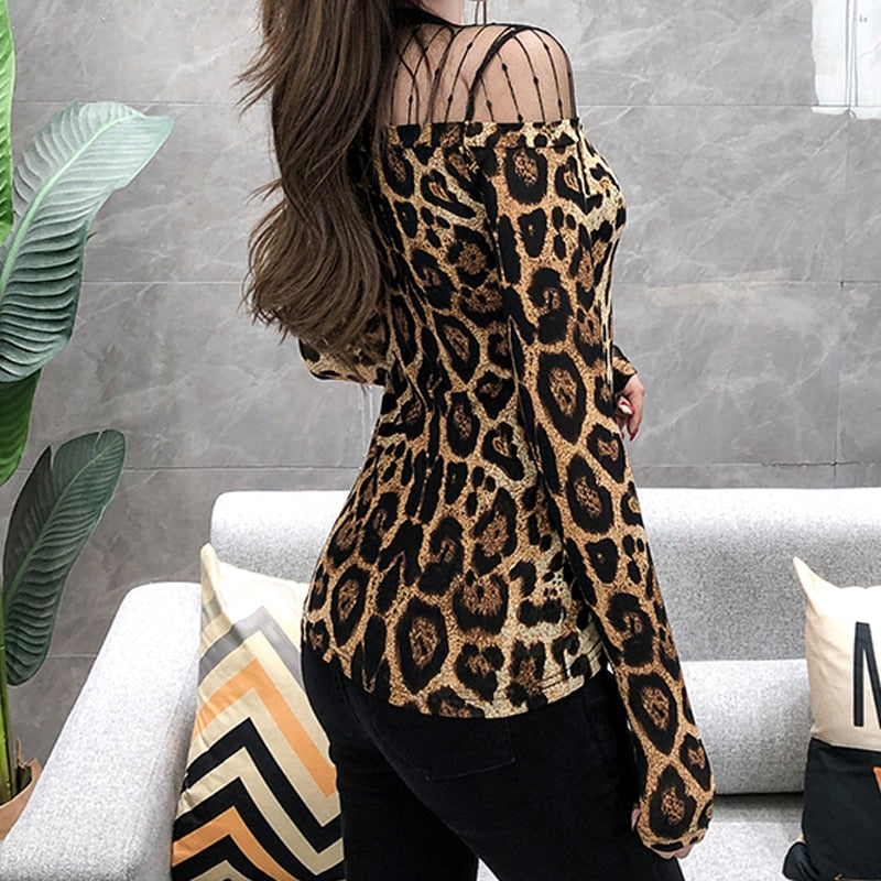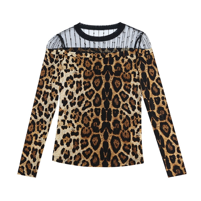 Long Sleeve Blouse With Leopard Pattern Decoration And O-Neck Collar