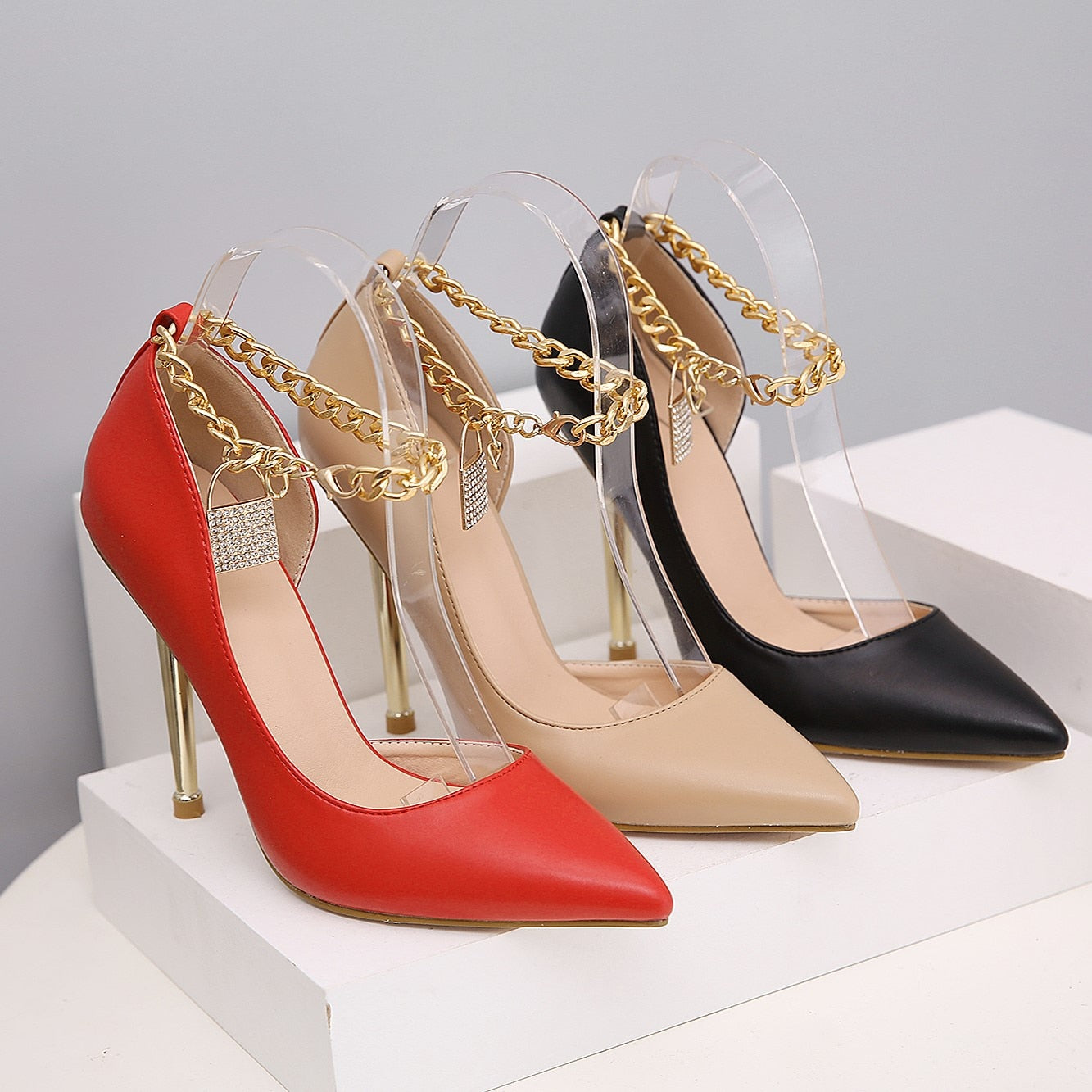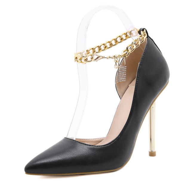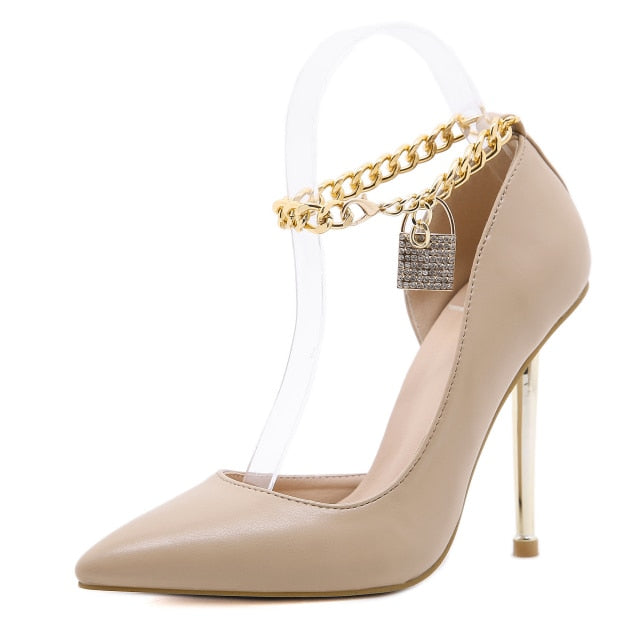Looking for a unique way to make a statement? Look no further than this chain ankle strap stiletto. This pointy-toe design is the perfect way to add a touch of glamour to any look. A stunning lock-charm ensures this style is a must-have for any occasion.