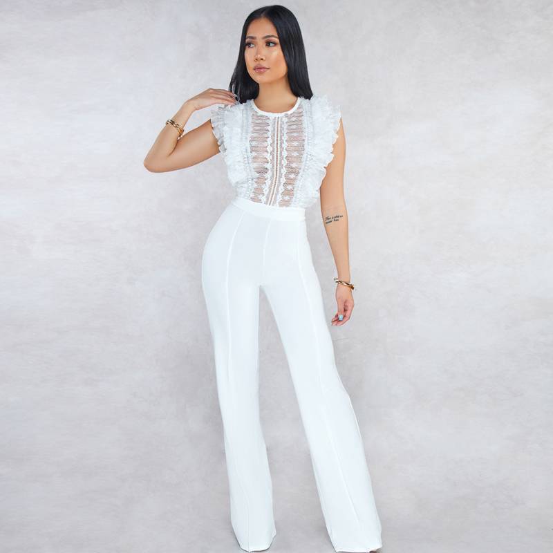 Sleeveless Polyester Spandex Jumpsuit with See-Through Lace Top