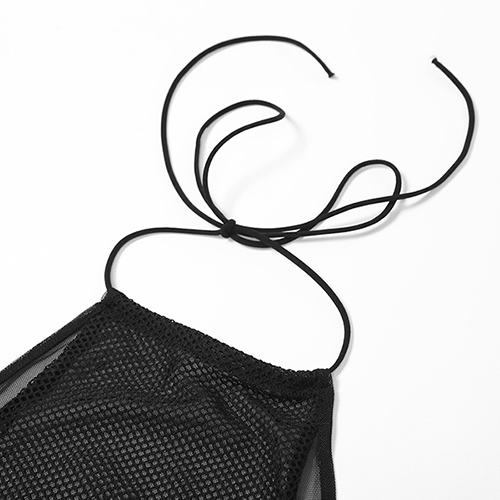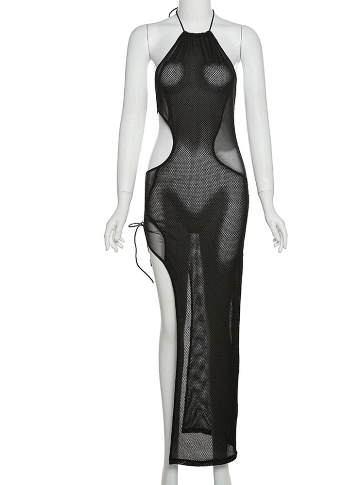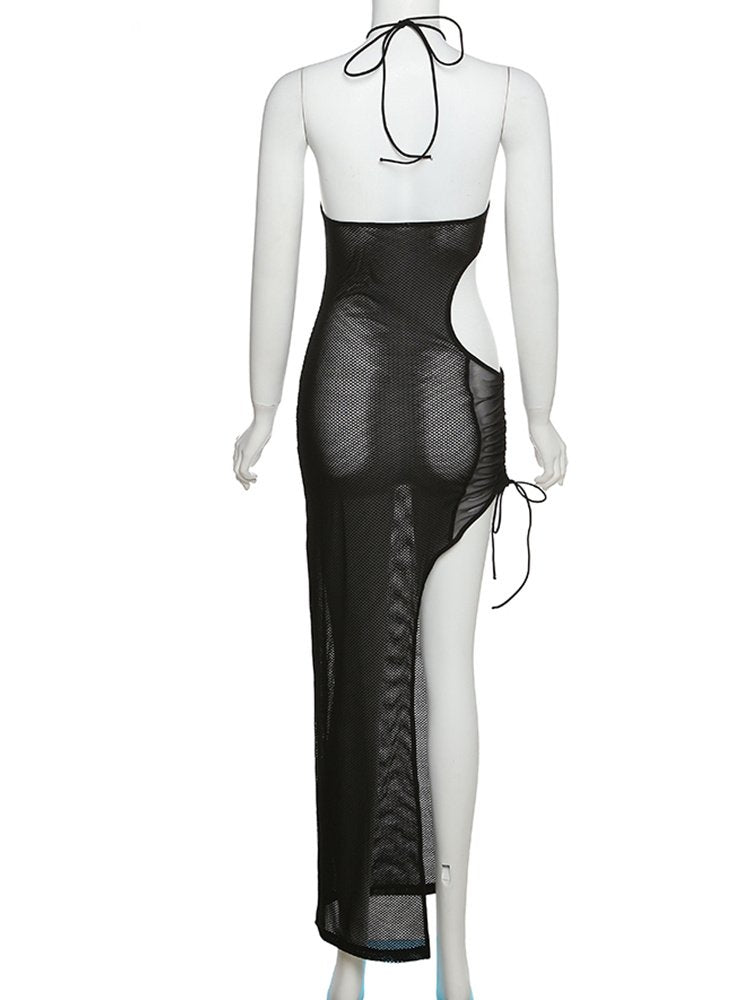 Spice up your summer outfit with this sexy summer dress. The hollow-out see-through fabric is perfect for a hot summer day. It also features a halter top, backless style with a high slit, and side ruched which is a gorgeous combination for a fun party outfit.