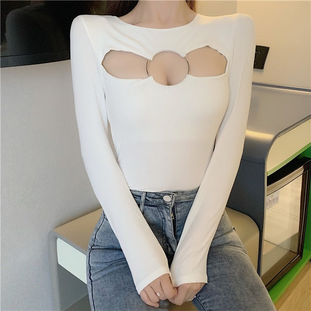 Solid O-Neck Collared Tee with Ring Decoration, Hollow Out, and Cotton Polyester Material