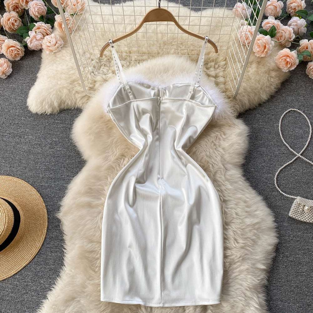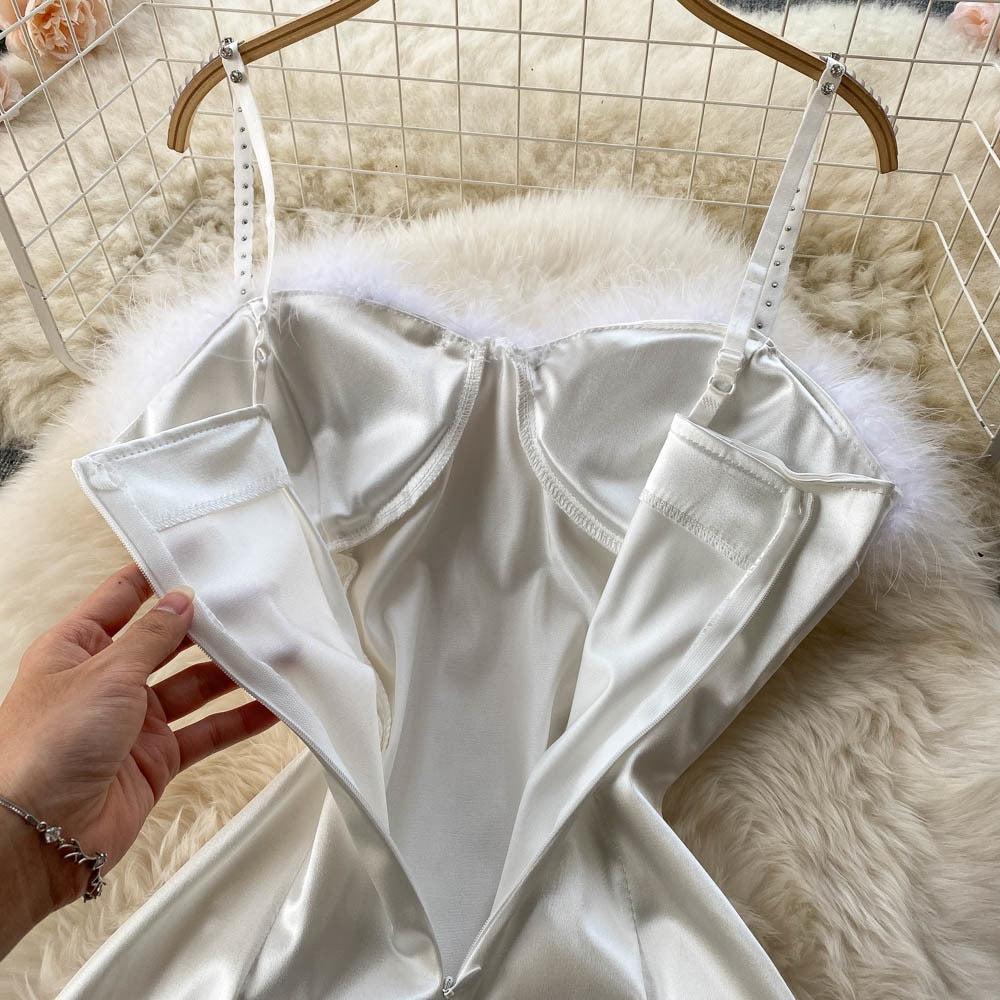 This amazing dress is a must-have for the glamorous woman. This dress is the perfect choice for evening parties and big events. It is made of high-quality satin fabric and it is so beautiful. Featuring a stunning fur detail and rhinestone, this gorgeous dress will appeal to anyone looking for a dress that stands out from the crowd.