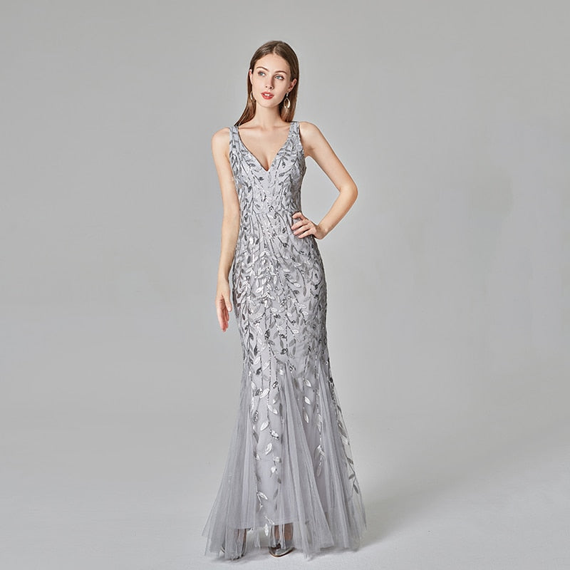 This gorgeous sleeveless long dress is perfect for any occasion. The fitted bodice features a v-neckline and floral sequin design. The floral pattern continues on the skirt. The dress is made of soft fabric that will feel great against your skin. Wear this dress to your next formal event or a night out with friends.