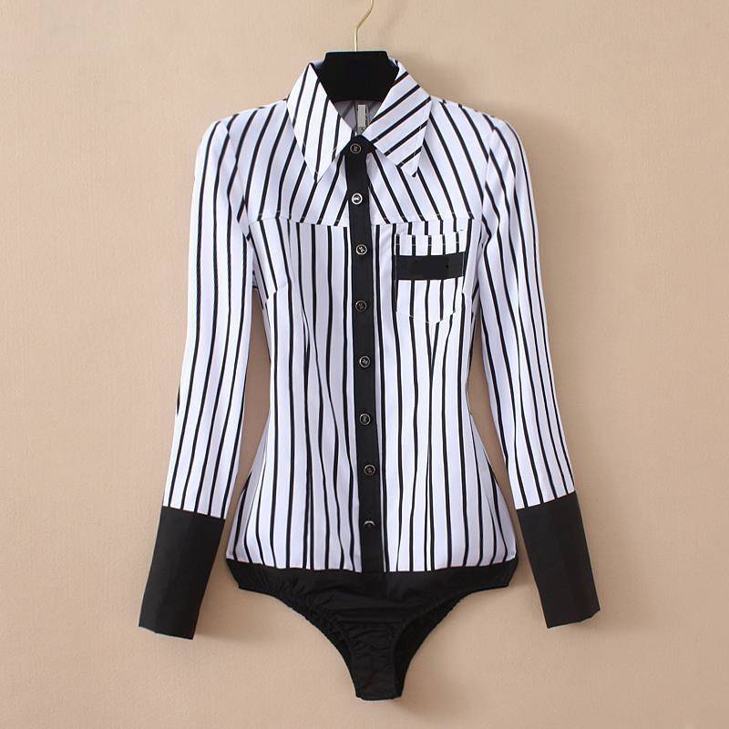 Long Sleeve Turn-Down Collar Bodysuit with Stipe Pattern, Pocket Decoration, and Polyester Material