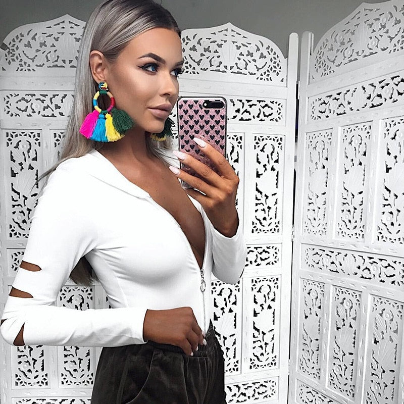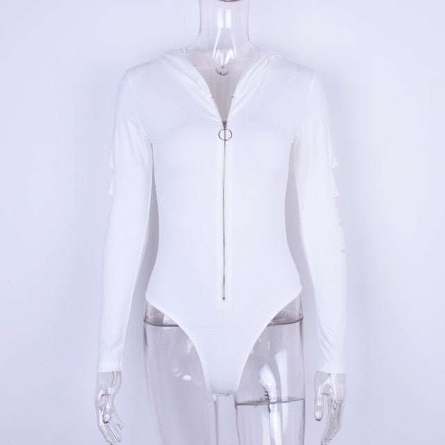 Solid Pattern Bodysuit With Hollow Out Decoration, Hoodie, And Cotton Polyester Material