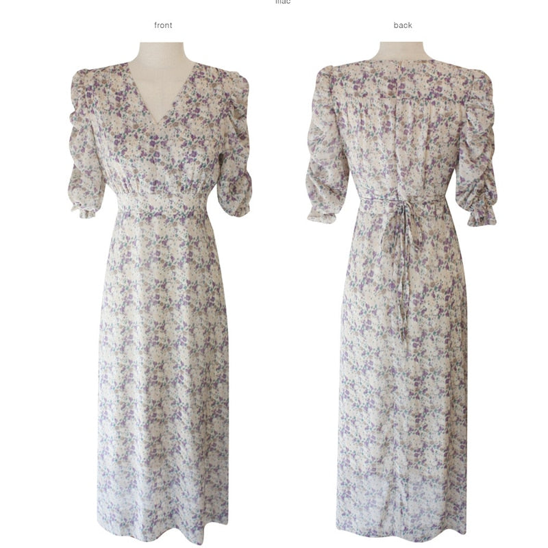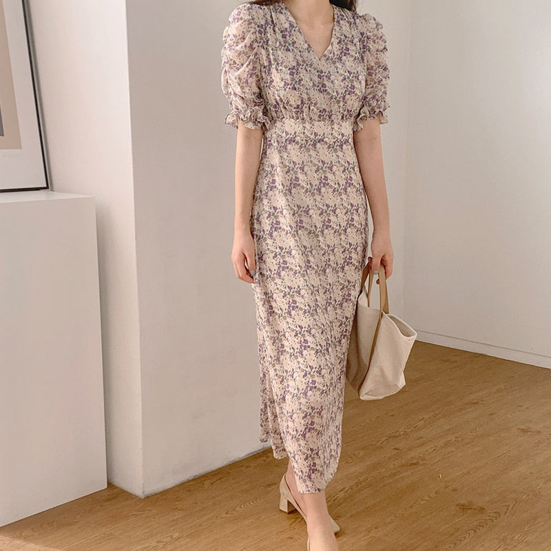 Short Puff Sleeve V-Neck Chiffon Midi Dress with Flower Pattern