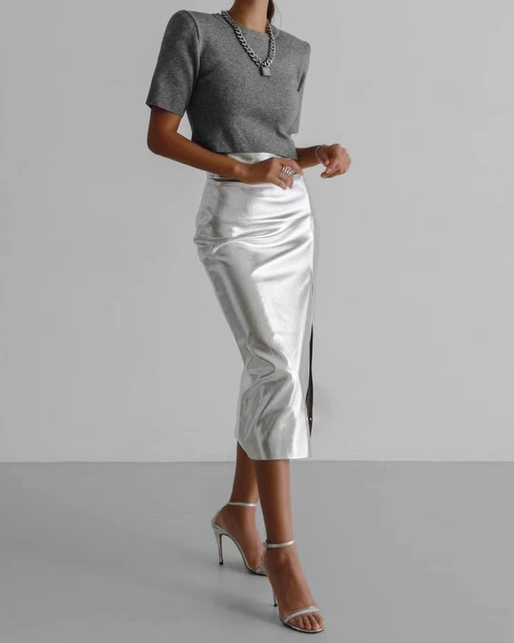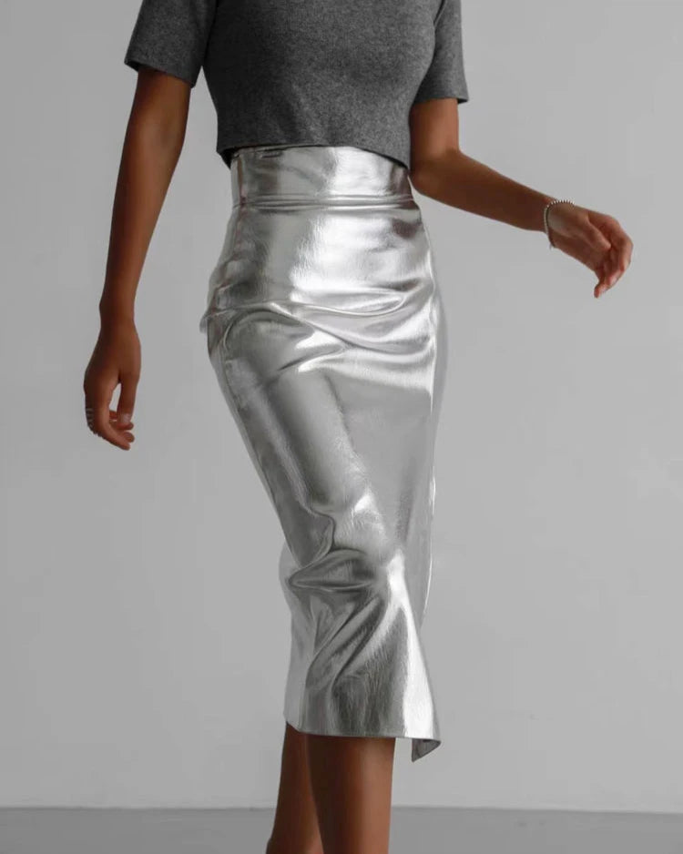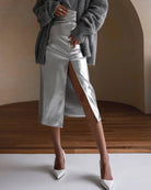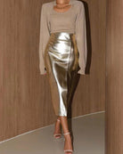 Make a bold statement with the Twilight Kissed Elegance Midi Skirt, crafted from sleek faux leather that catches the eye and commands attention. Its solid pattern sharpens your silhouette, perfect for daring nights where style meets edge. Elevate your wardrobe with a skirt that exudes confidence and fearless sophistication.