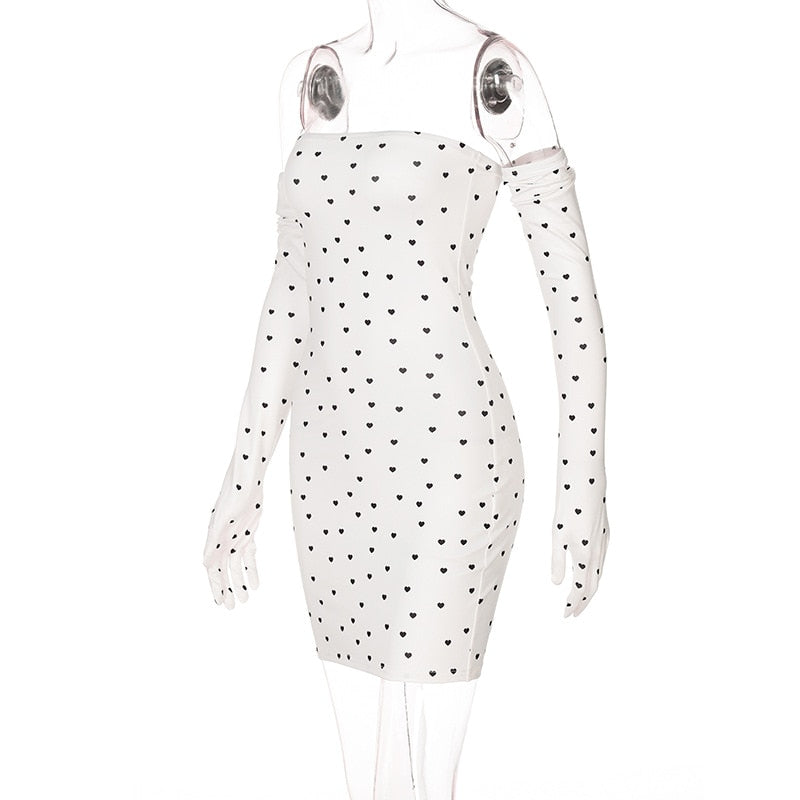 A strapless mini dress that is perfect for any occasion. A chic heart print gives this versatile fashion piece a unique and fashionable look. Designed with a simple strapless design that is sure to become a staple for any wardrobe. The simple design makes it easy to move around in with ease. A playful look that is sure to catch the eye of any passerby.