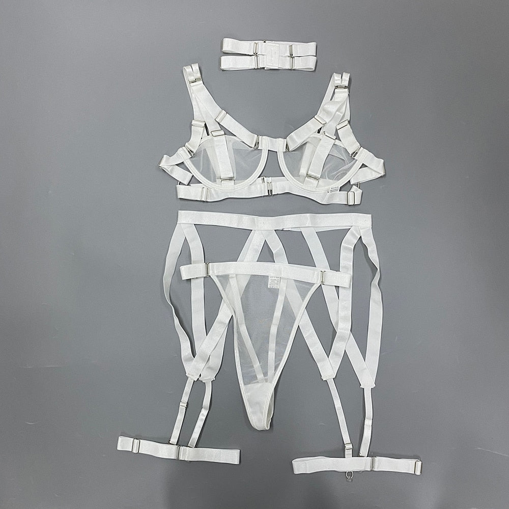 If you like sexy and edgy lingerie, then this set is for you. Made of see-through white polyester, the solid strap design is complete with a collar and garter belt. Designed to make you feel confident and sexy, this set is sure to complement any outfit. The underwired cup design is perfect for all-day wear.