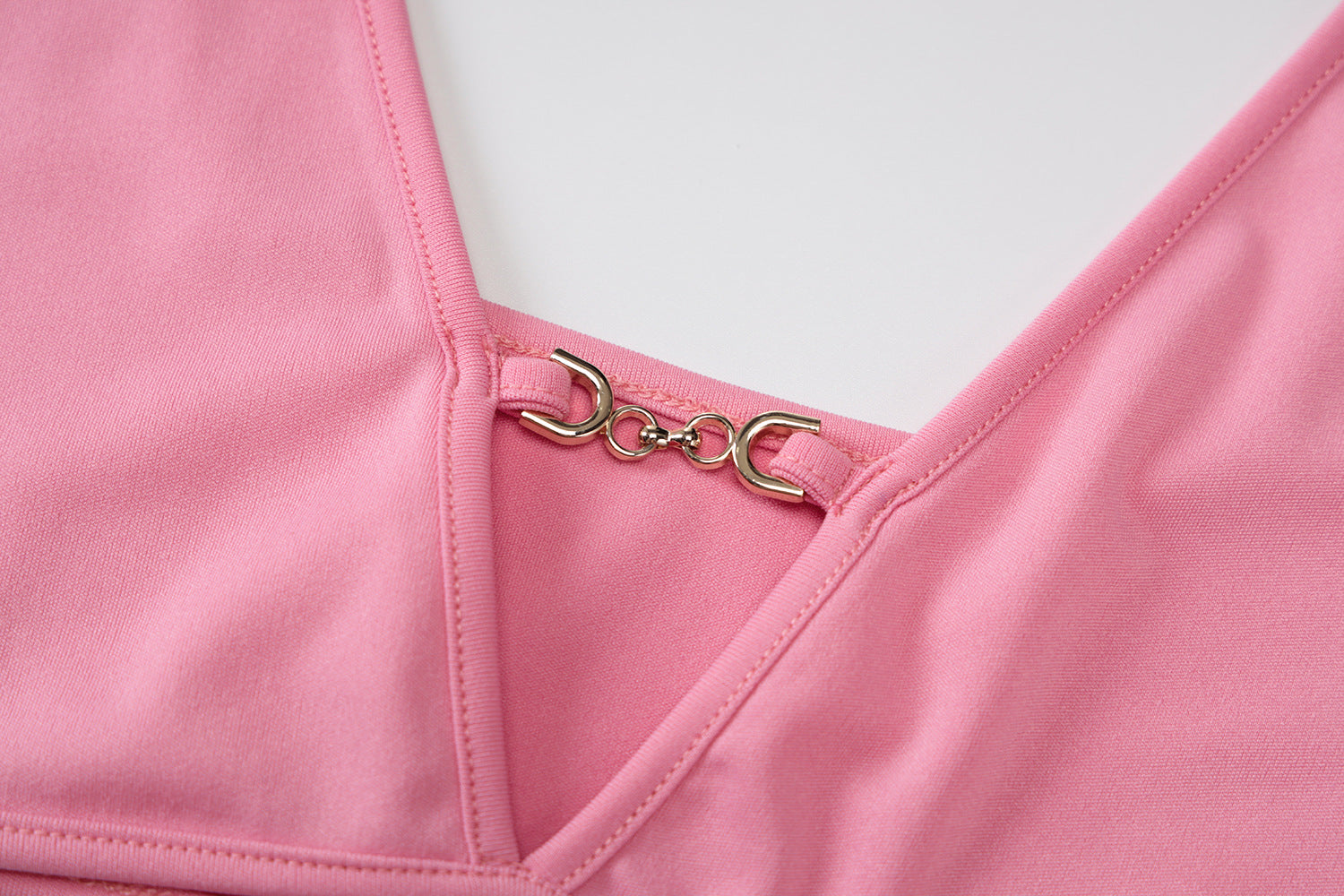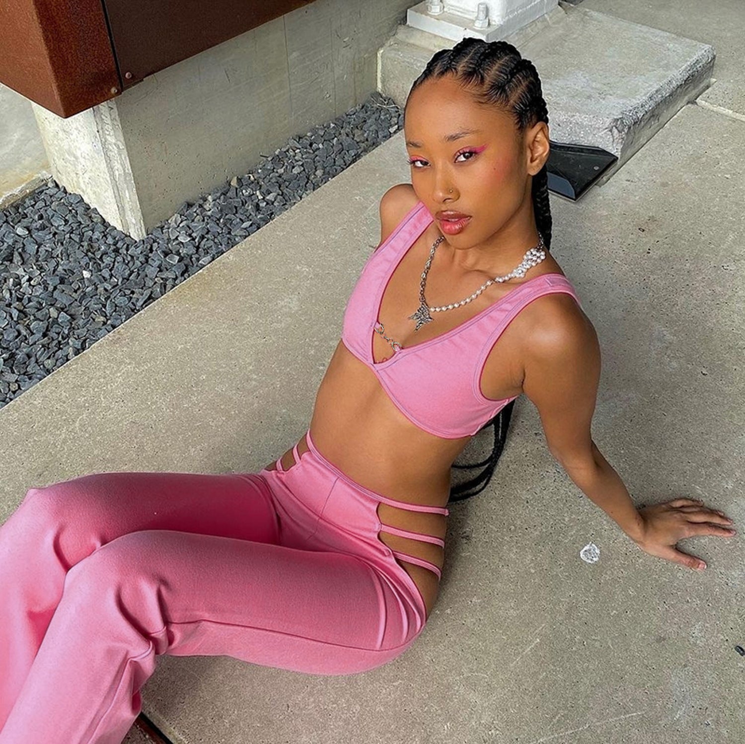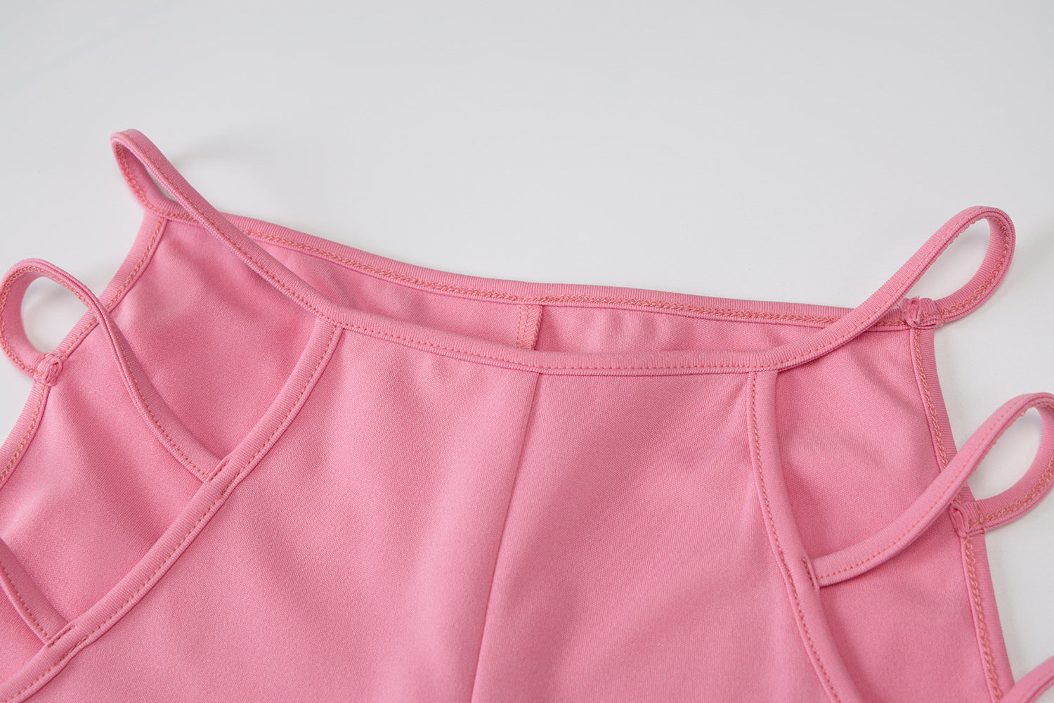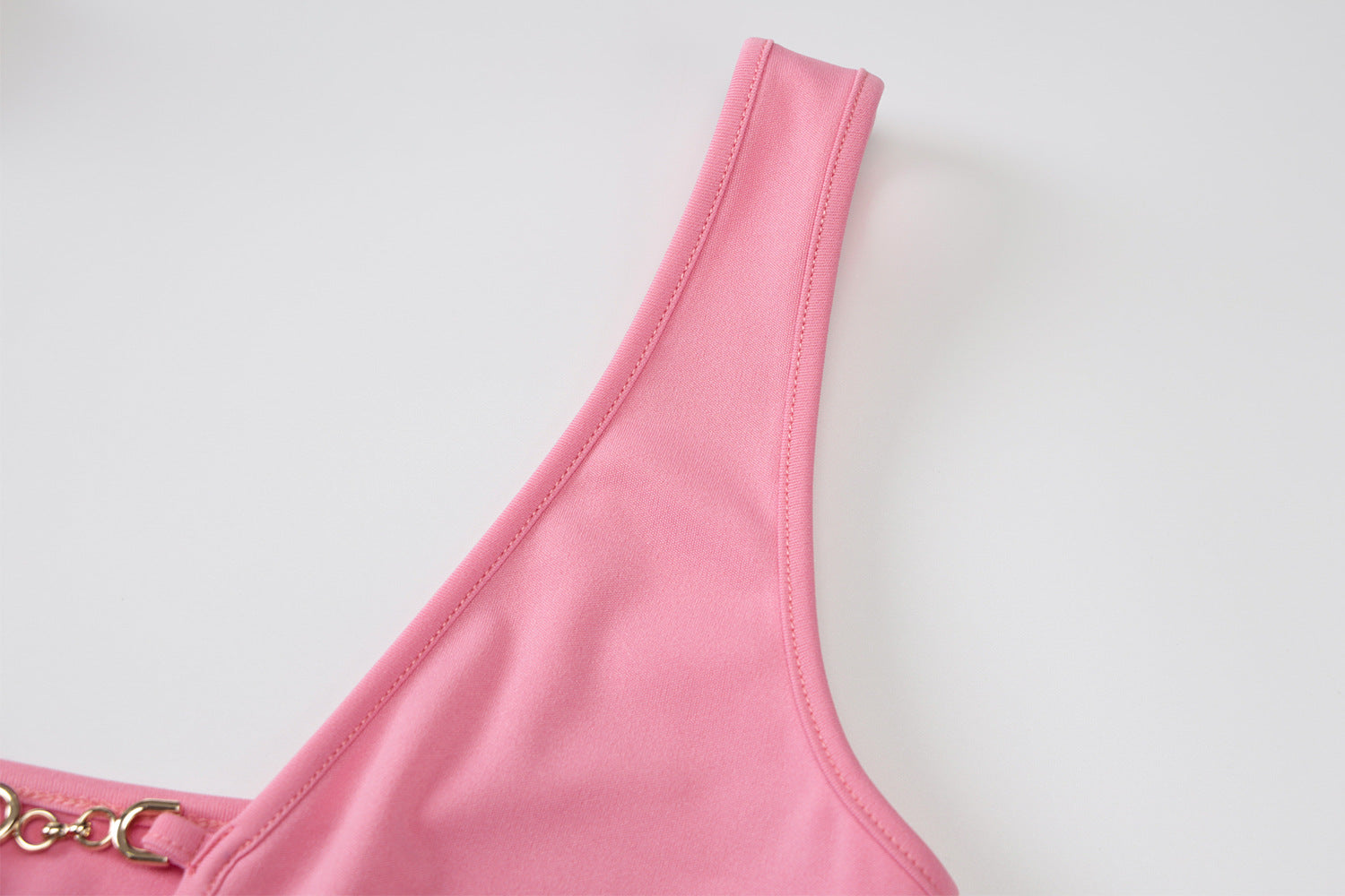This pants set is totally must-have item for summer. The hollow out on the right and left side of the pants add a fun and unique look. The top set is a seamless bra with a chain strap decoration at the front.