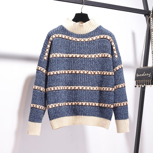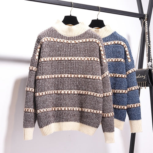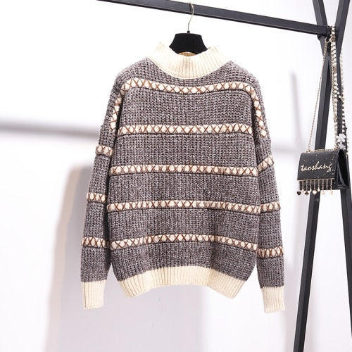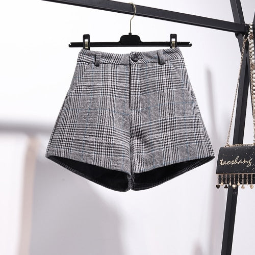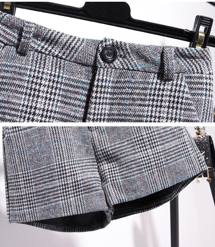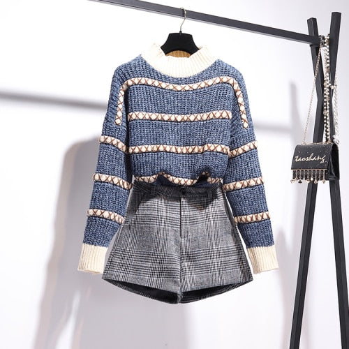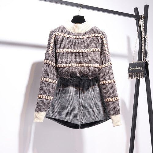 Geometric Stripe Patterned Sweater with Polyester Material. Plaid Patterned High-Waist Shorts with Pocket and Zipper Fly Closure