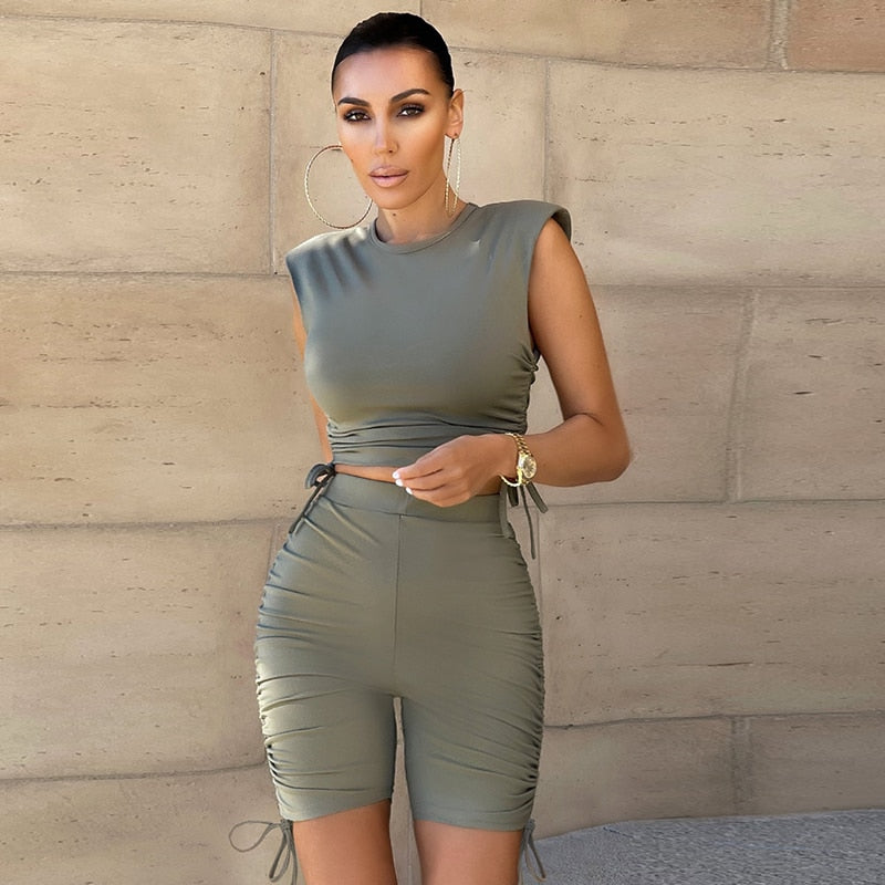 Solid Polyester Spandex Short Sets with Drawstring Decoration and Sleeveless Crop Top
