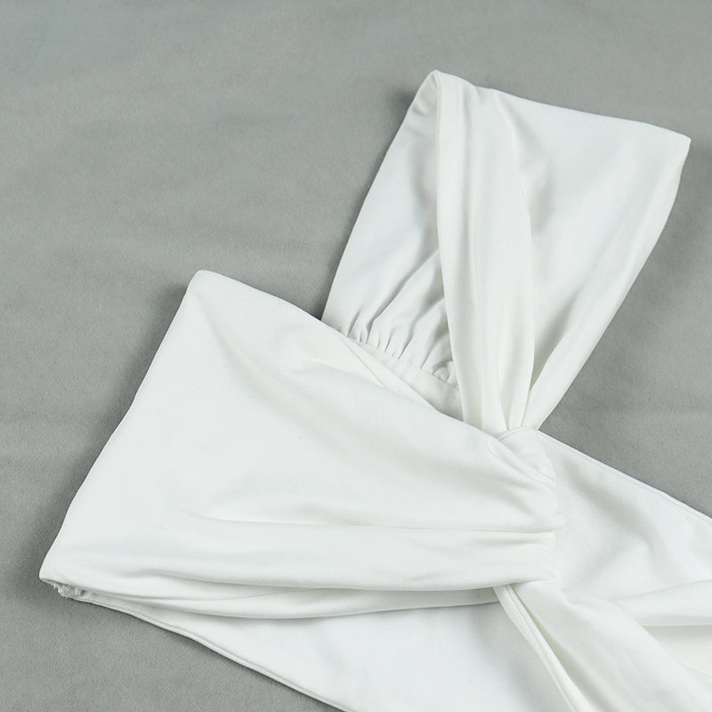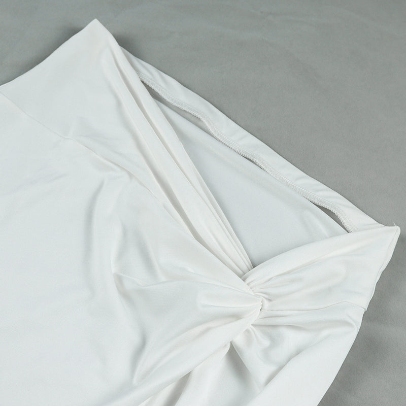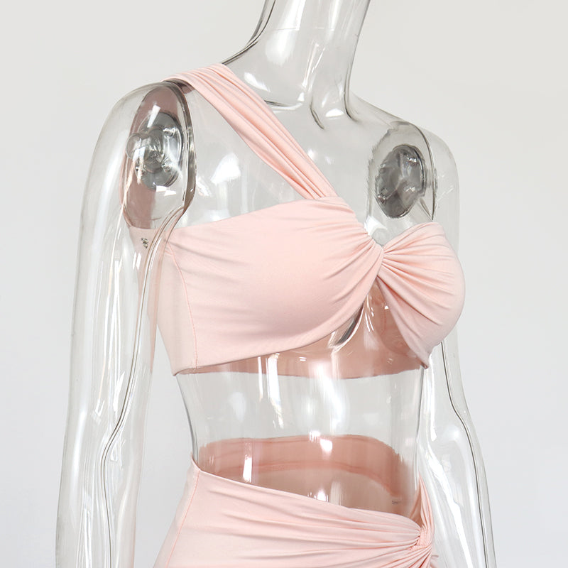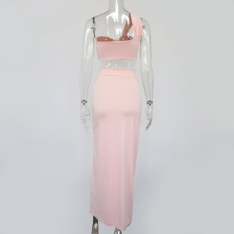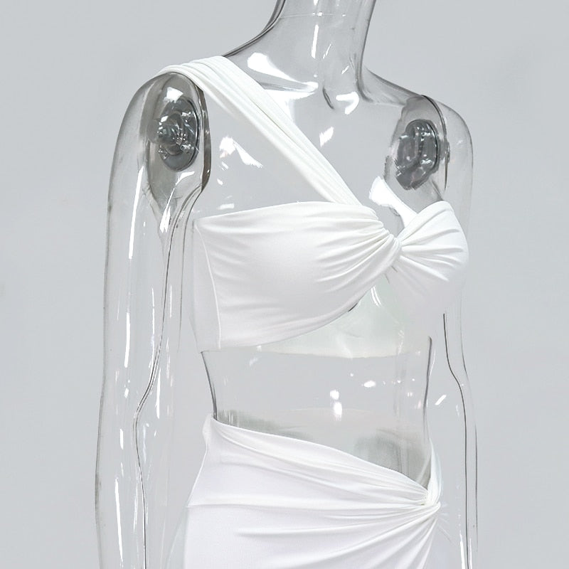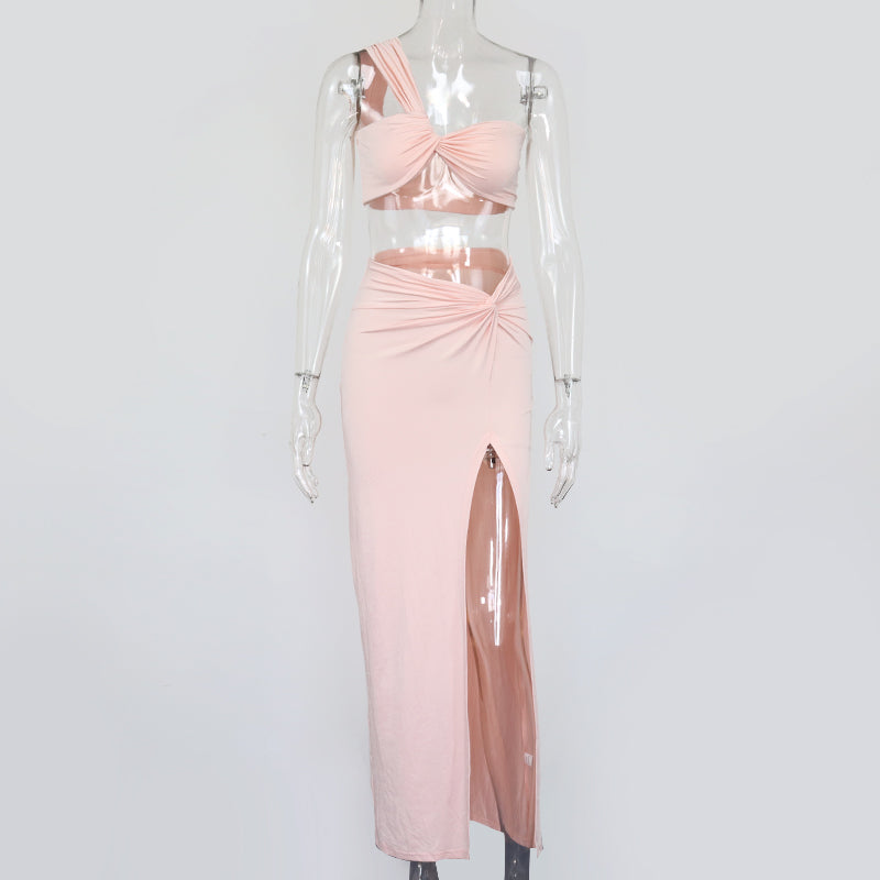 Solid Sleeveless Polyester Spandex Skirt Set with Twisted Knots Style and Slitted Long Skirt