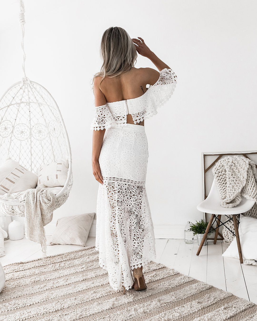 Floral Lace Skirt Set with Off-Shoulder Crop Top and Mullet Skirt