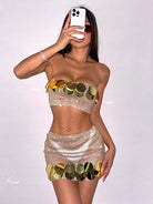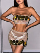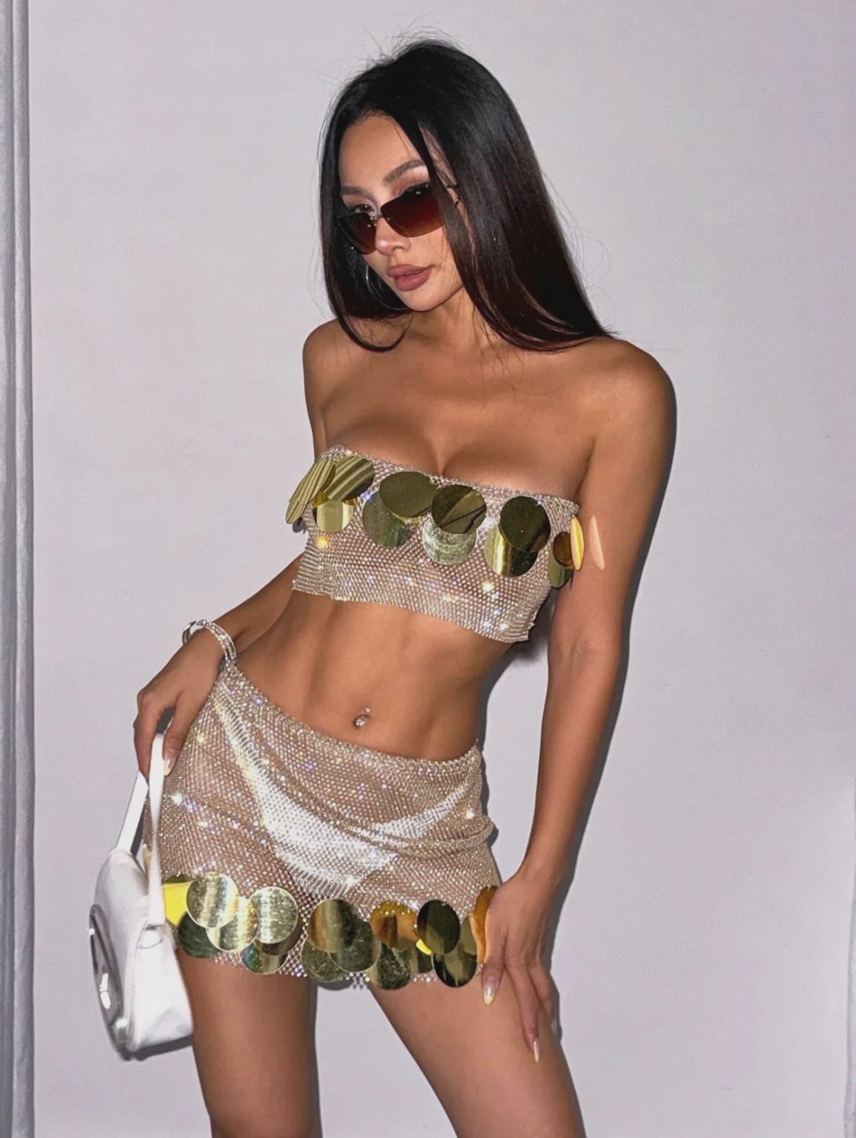 Command the spotlight with the Stardust Crown Skirt Set, featuring a bold top and skirt crafted from smooth polyester for a sleek, flattering fit. This daring duo combines edgy design with comfortable wearability, perfect for making a powerful statement at any event. Elevate your wardrobe with a set that exudes confidence and luminous charm.
