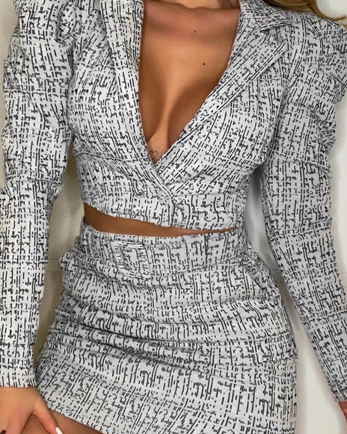 Full Geometric Patterned Long-Sleeved Crop Blazer and Mini Skirt Set Made From Polyester Spandex Material with