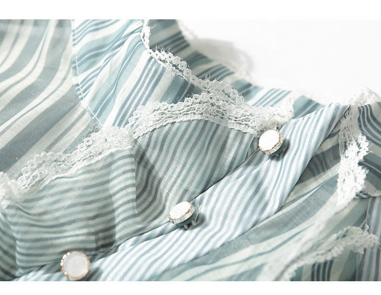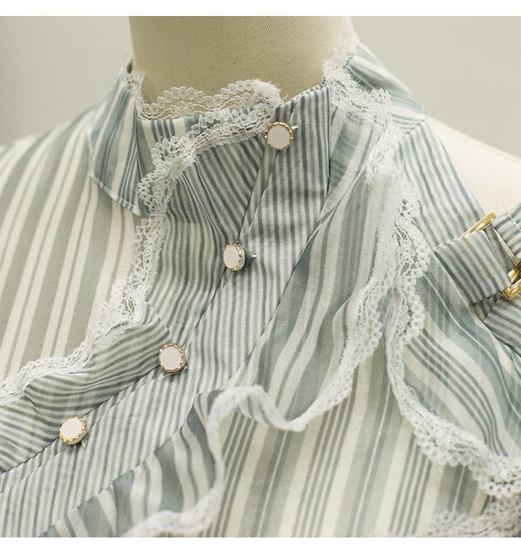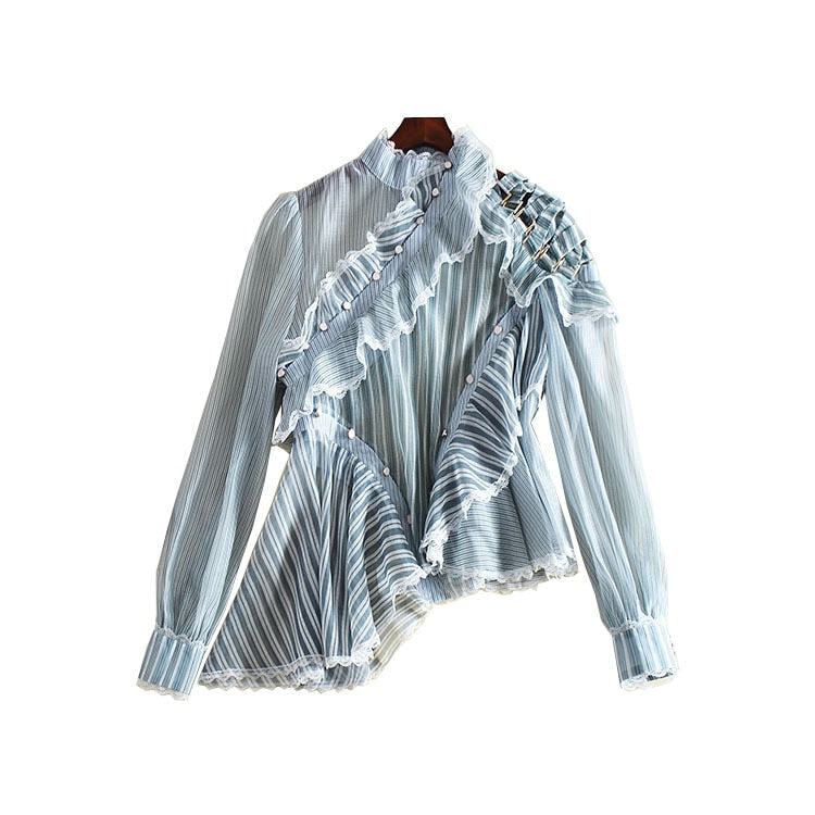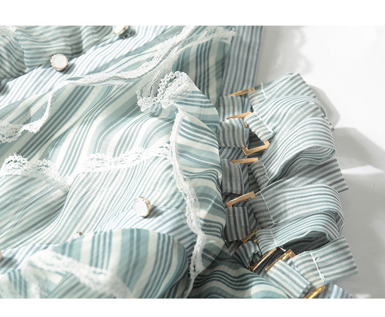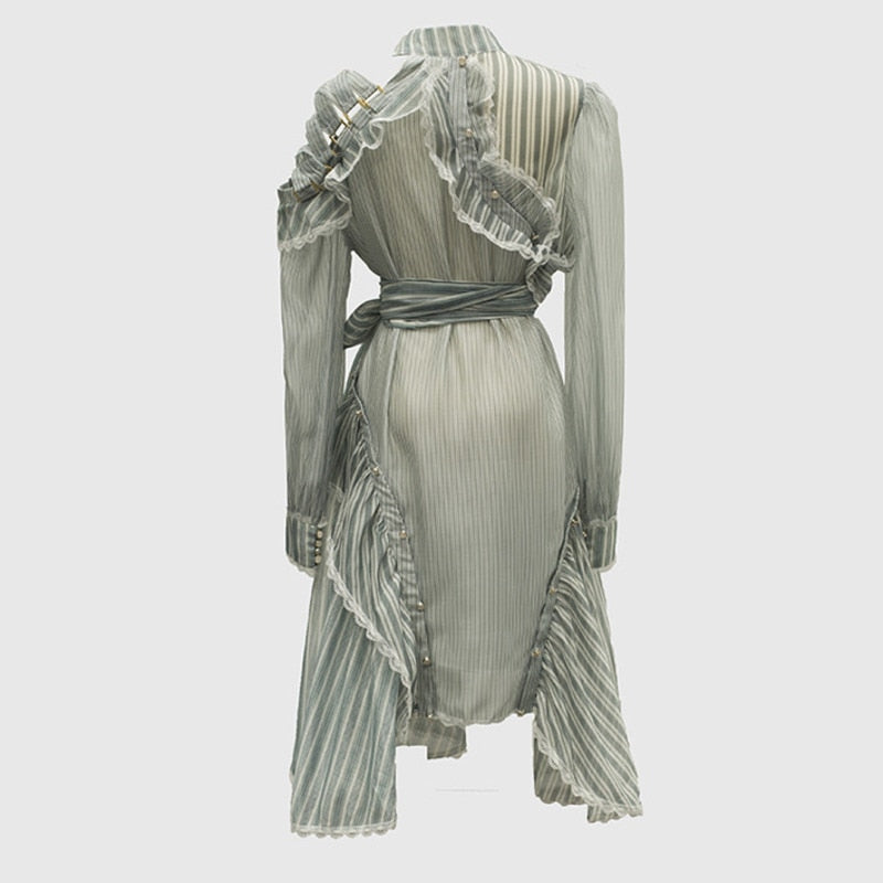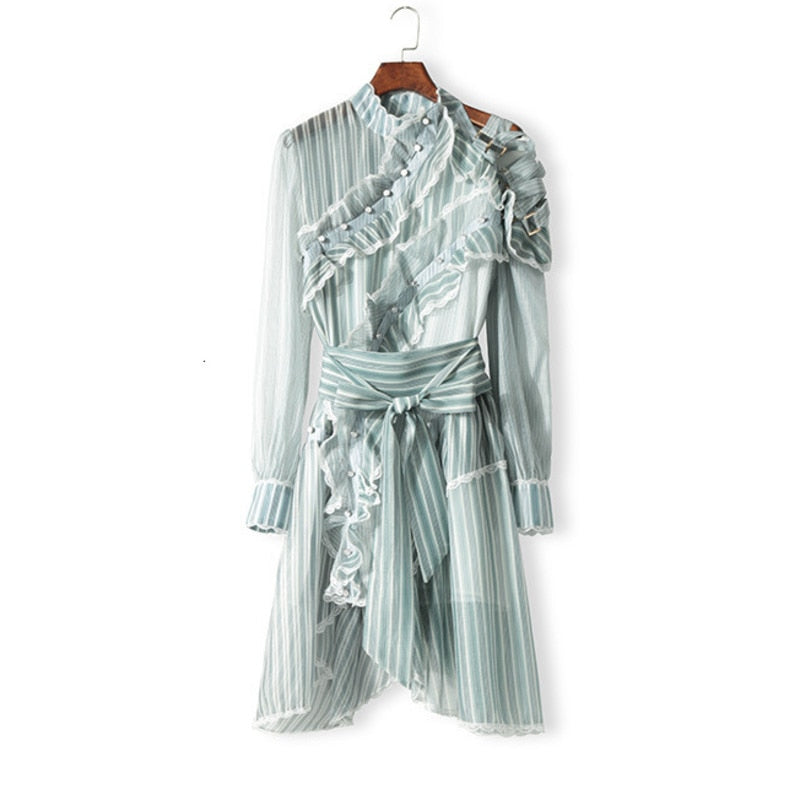 With the ruffle detailing and trendy stripe pattern, this mini dress is sure to turn heads. A slightly oversized look is achieved with the strap buckle decoration on the shoulder. This style is available in a mini dress and shirt.