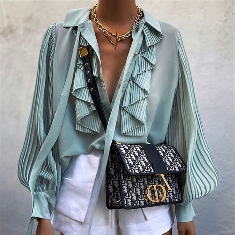 Lantern Sleeve Blouse with Ruffles Decoration and Turn-Down Collar
