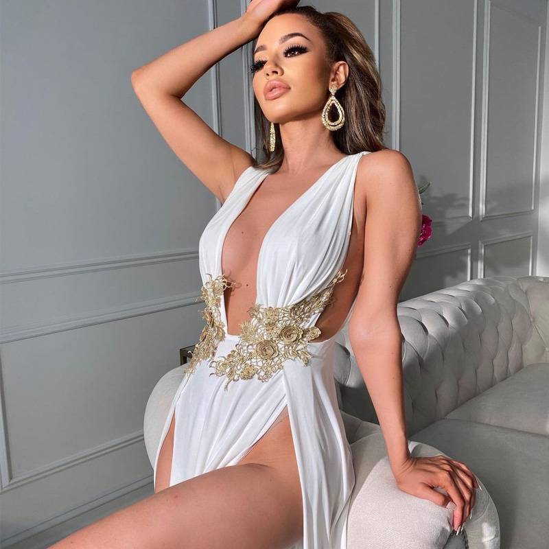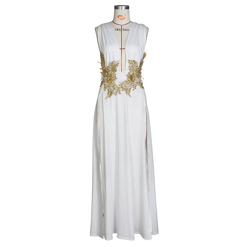 Sleeveless A-Line Long Dress with High Slit and Floral Lace Applique