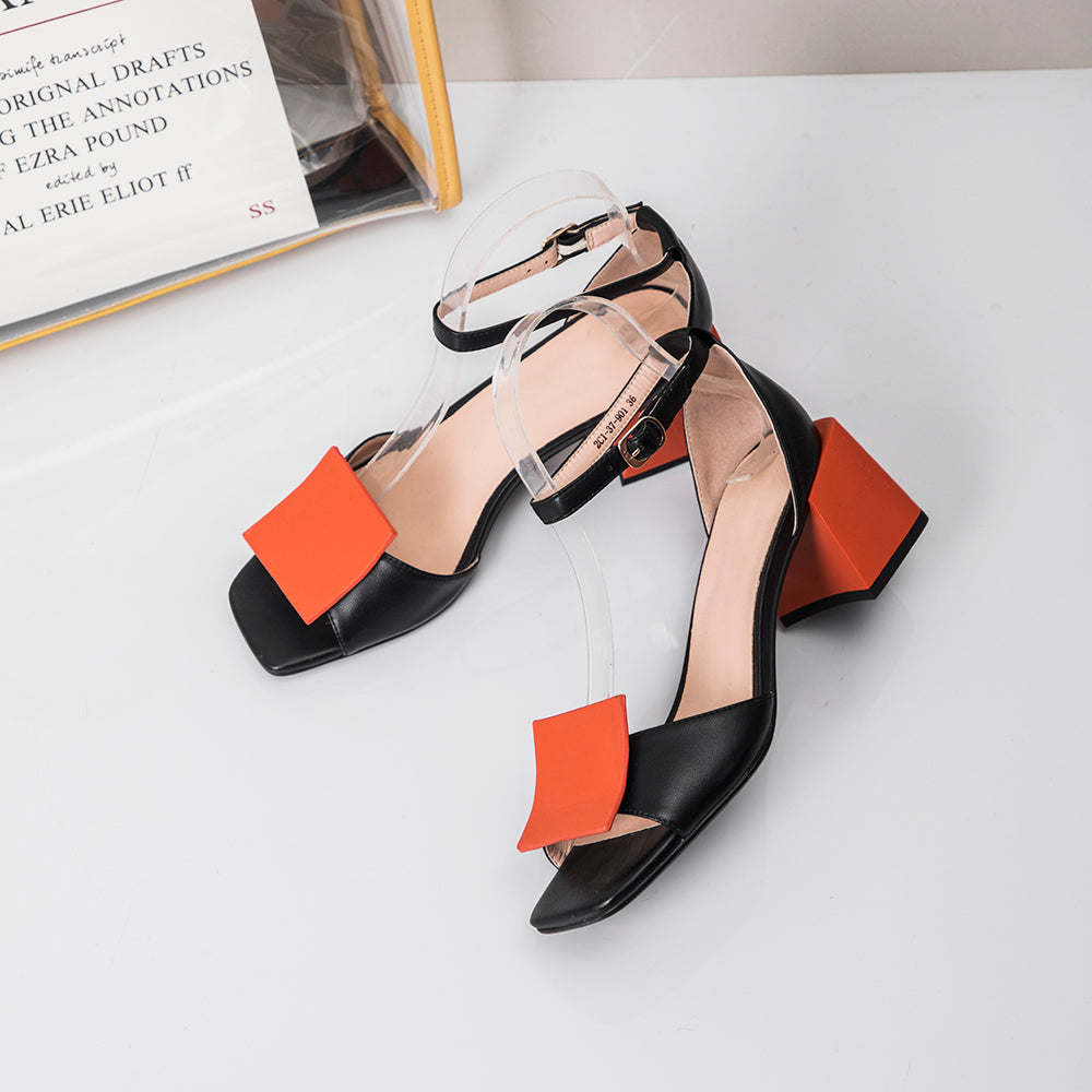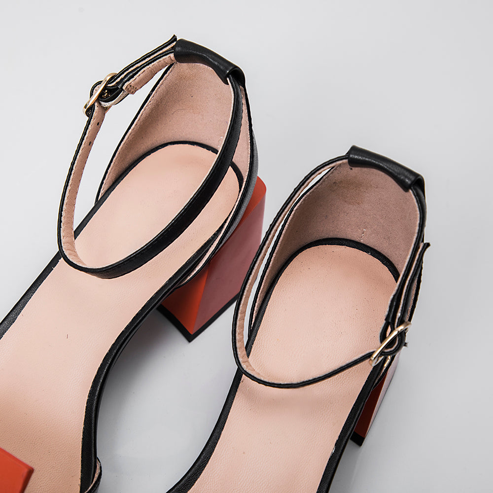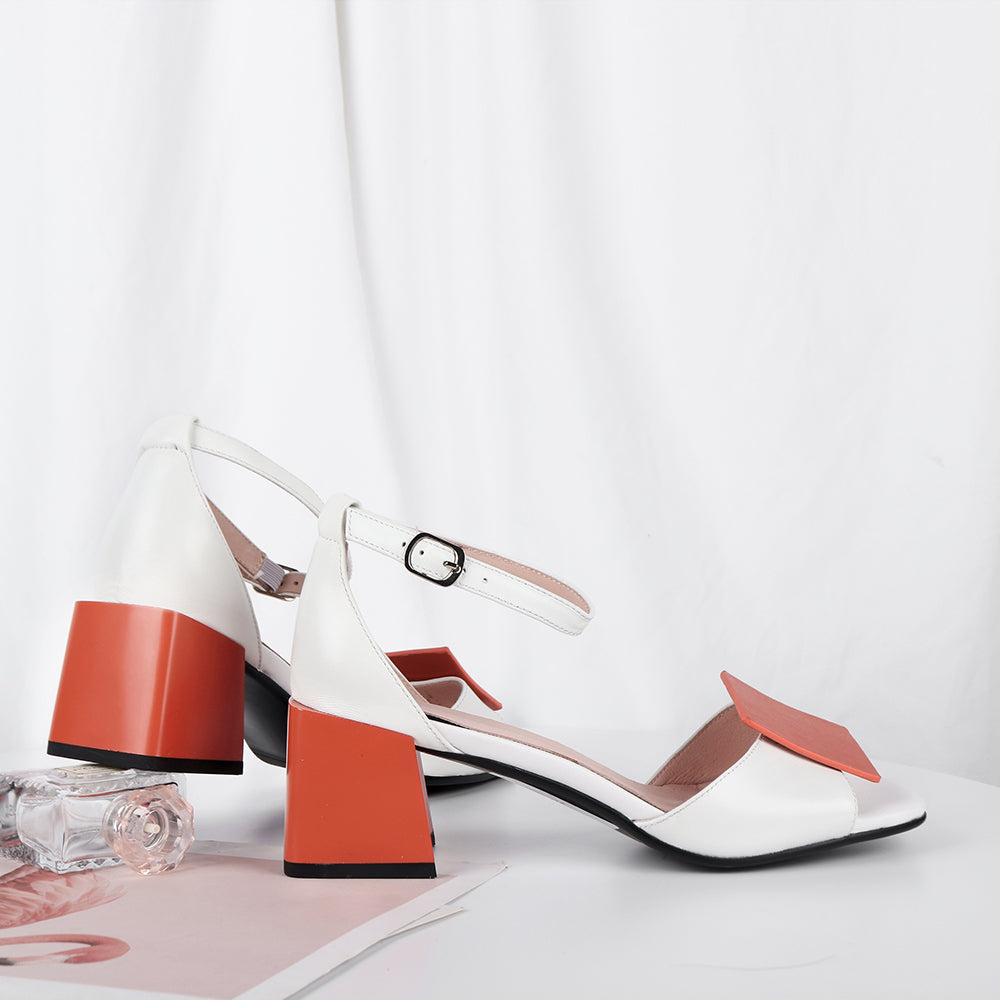 Solid Genuine Sheepskin Leather Sandals with Chunky Heels, Square Shaped Applique Decoration, and Ankle Strap Closure